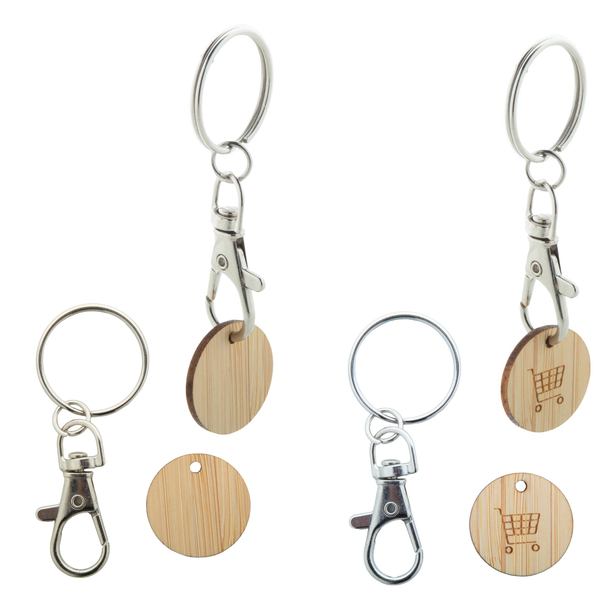 Porte-clés mousqueton en métal et jeton en bois de bambou avec sur une face, la gravure d’un chariot. L’autre face est pour votre logo. Comme le bois est un produit naturel, des différences de veinage, de couleur et de finition sont possibles. Le bois travaille par rapport à la température et à l’humidité. La fonctionnalité à 100 % ne peut être garantie