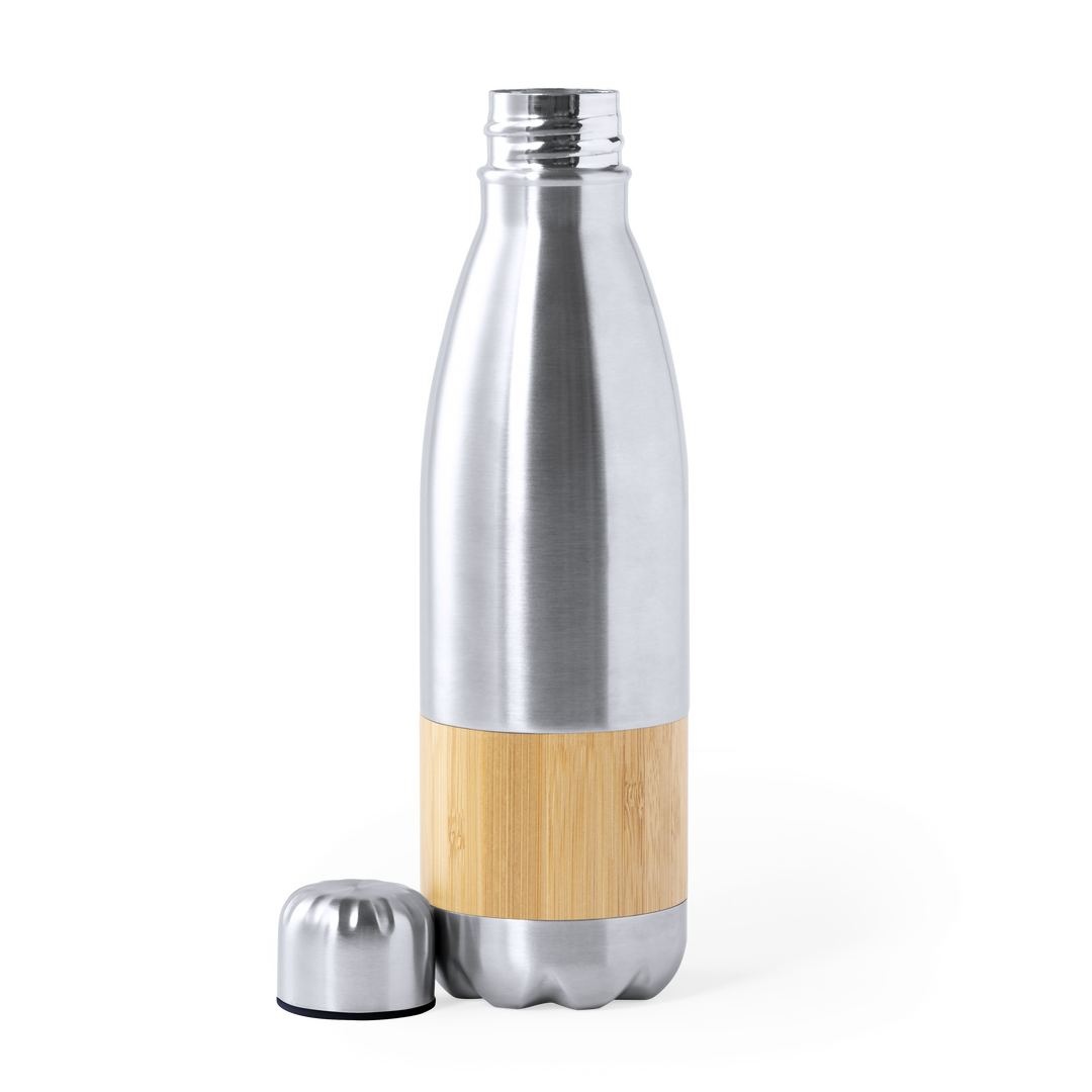 Bouteille de la ligne Nature, dans une combinaison de matériaux en acier inoxydable avec une finition mate et en bambou. Contenance 750 ml, avec bouchon de sécurité et présenté dans un joli coffret éco design.