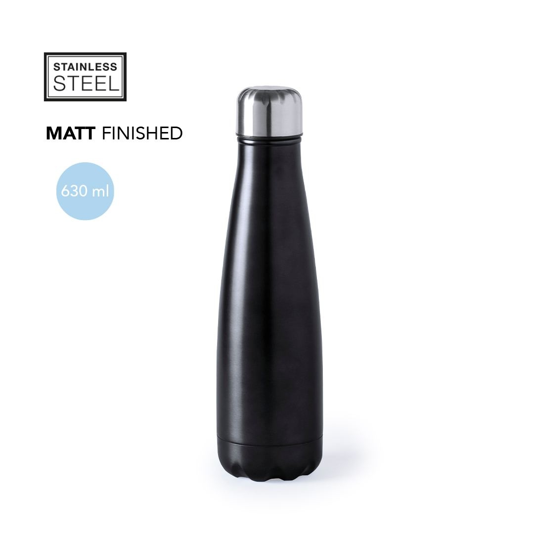 Bidon en acier inox 630ml. Avec bouchon de sécurité à vis. Et avec finition mate dans des couleurs vives et variées. Présenté individuellement dans une boîte.