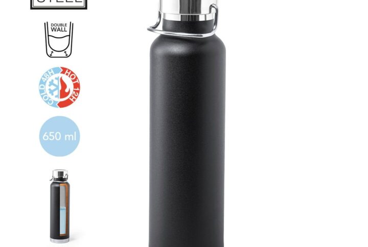 Bidon en acier inox 630ml. Avec bouchon de sécurité à vis. Et avec finition mate dans des couleurs vives et variées. Présenté individuellement dans une boîte.