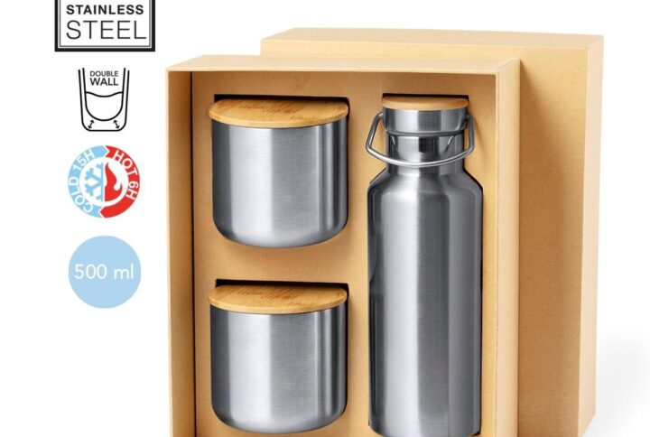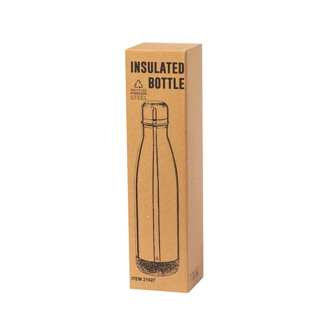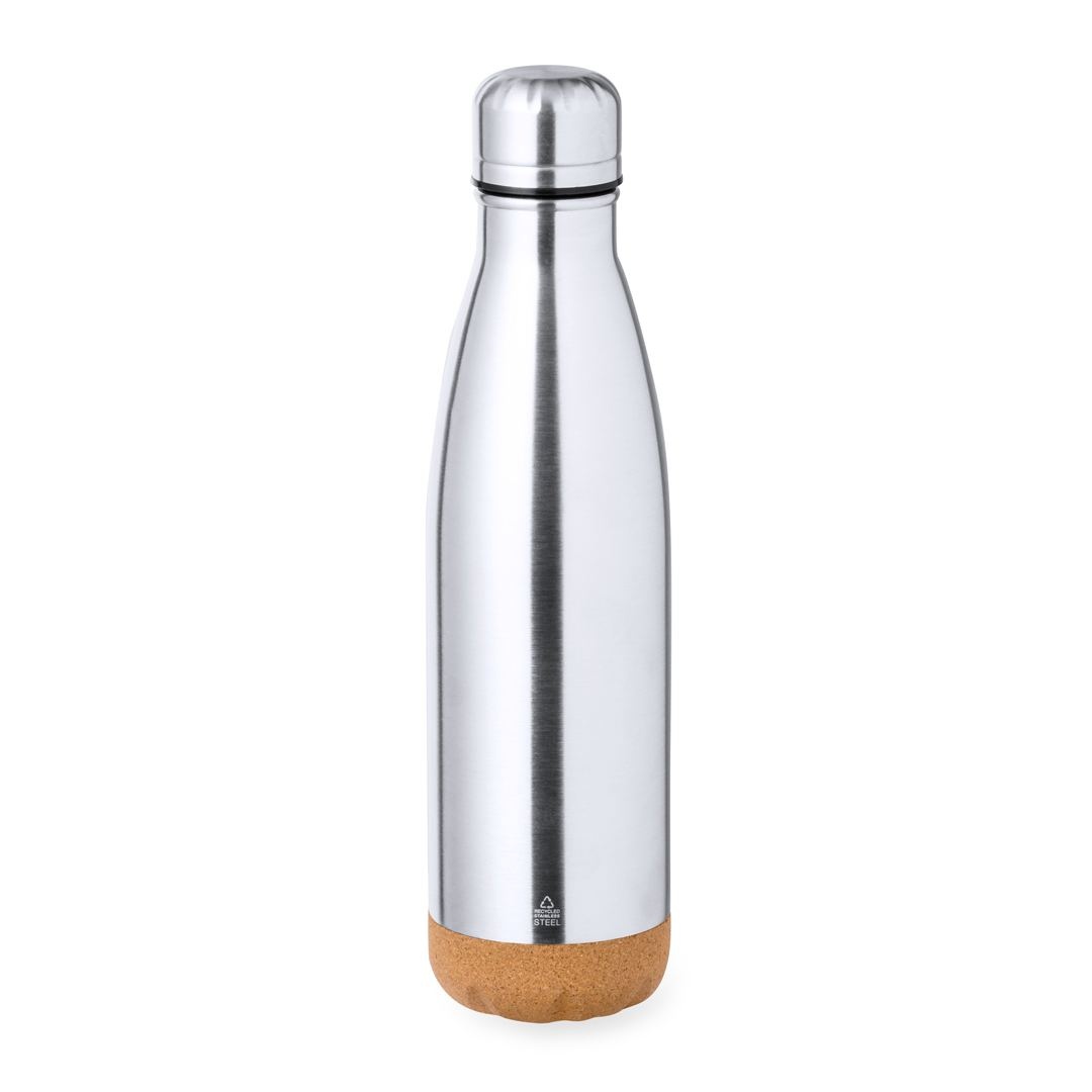 Bidon thermique double couche en acier inox recyclé dans 500 ml de capacité. Finition argent, avec bouchon à vis assorti et base en liège naturel. Avec de l’acier inoxydable recyclé Logo, sans BPA et présenté dans une boîte unique de conception kraft.L’acier est l’un des matériaux les plus demandés et peut être trouvé presque partout, des produits d’usage quotidien aux grandes constructions. Avec d’innombrables propriétés, y compris la durabilité et un haut degré de réutilisation, ce qui en fait une alternative très appréciée dans des solutions de durabilité. Bien traité, il permet d’obtenir de nouvelles ressources d’une utilisation infinie.