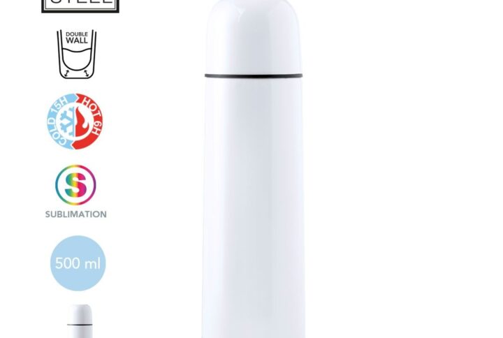 Bidon thermique d’une capacité de 500 ml, fabriqué en acier inoxydable à double paroi et spécialement conçu pour le marquage en sublimation. Finition blanc brillant et bouchon à vis original en acier inoxydable, avec détail en bambou et poignée intégrée. Sans BPA et présenté dans une boîte individuelle au design kraft.Manuel d’instructions disponible en espagnol et en anglais.