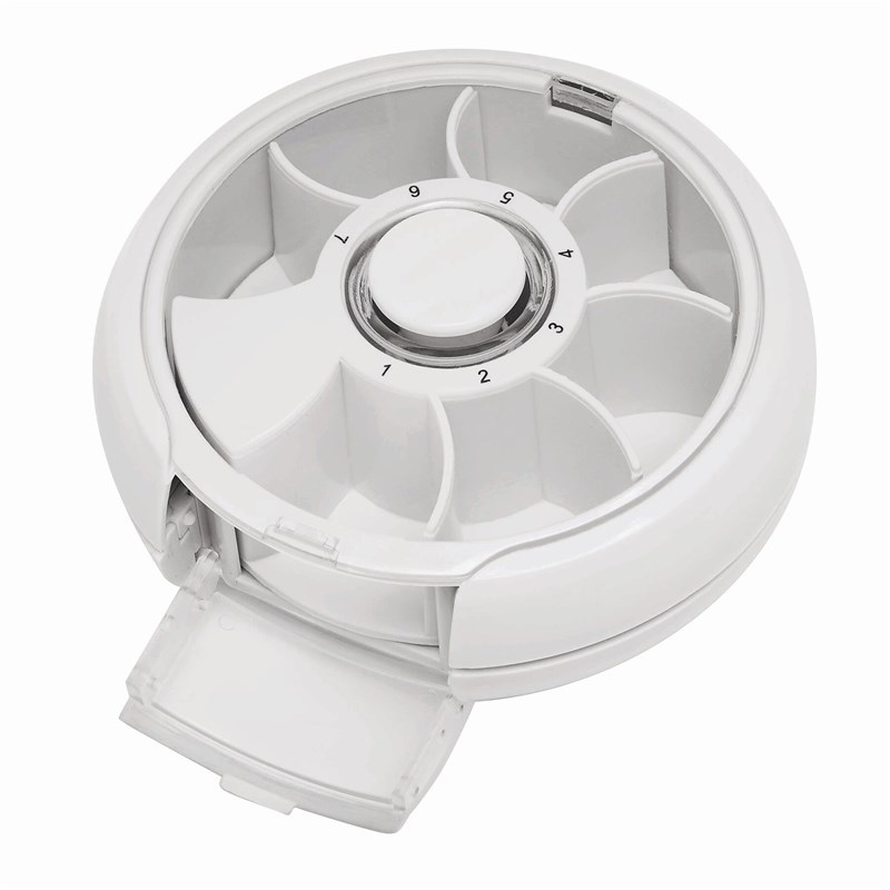 Boîte à comprimés DAY BY DAY: avec 7 compartiments, fonctionne avec bouton pression, ouverture latérale pliable