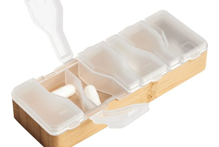 Boîte à comprimés DAY BY DAY: avec 7 compartiments, fonctionne avec bouton pression, ouverture latérale pliable