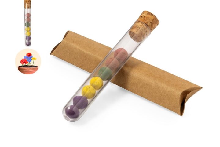 Bille de graines, présenté dans un étui en carton recyclé avec des instructions de plantation et un badge Made in Europe. Fleurs sauvages dans des couleurs assorties.