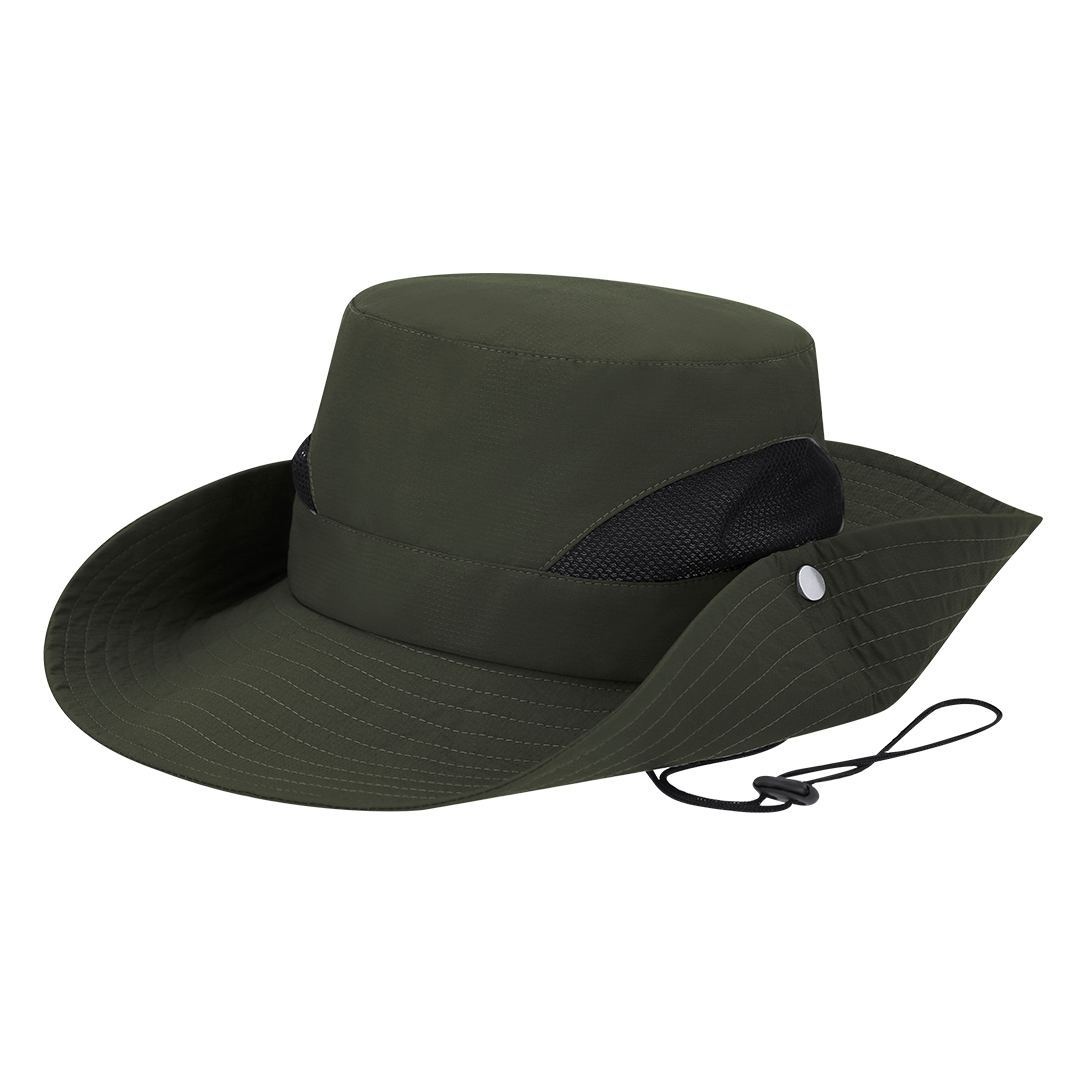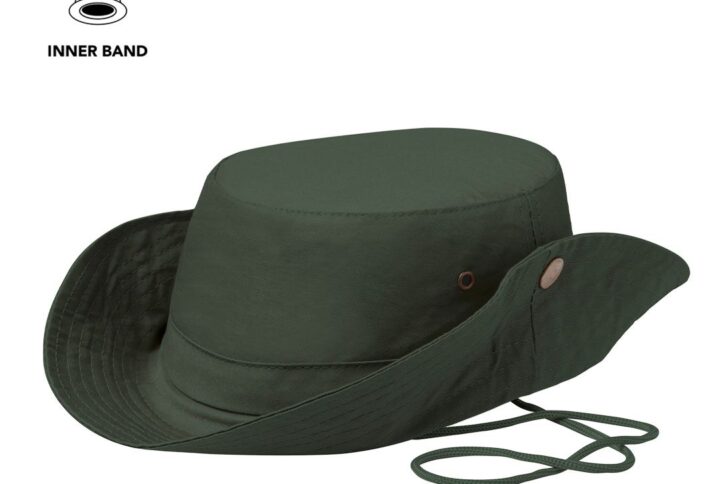 Chapeau de style safari en matériau polyester résistant. Avec intérieur confortable, doté de grilles de ventilation latérales rafraîchissantes en tissu respirant. Visage ajustable avec fermetures à boutons métalliques et cordon de transport ajustable.