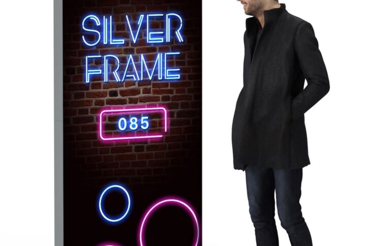 Enseignes lumineuses aussi appelées lightbox. Ces stands lumineux sont composés d’un châssis en aluminium d’épaisseur 8cm agrémenté de deux bandeaux de LED sur la hauteur, le tout reposant sur deux pieds larges pour garantir la stabilité. L’impression est réalisée en sublimation numérique sur une toile diffusante 190g/m² au recto-verso (recommandé) ou recto avec verso noir. Fixation des toiles par bande de silicone sur le contour du tissu. Le montage se fait par glissement du silicone dans la rainure du profilé aluminium. Changement de visuel en moins de 1 minute. L’ensemble est livré dans un sac de transport avec carton individuel. Utilisation indoor exclusivement. Nécessite une prise électrique 220V.