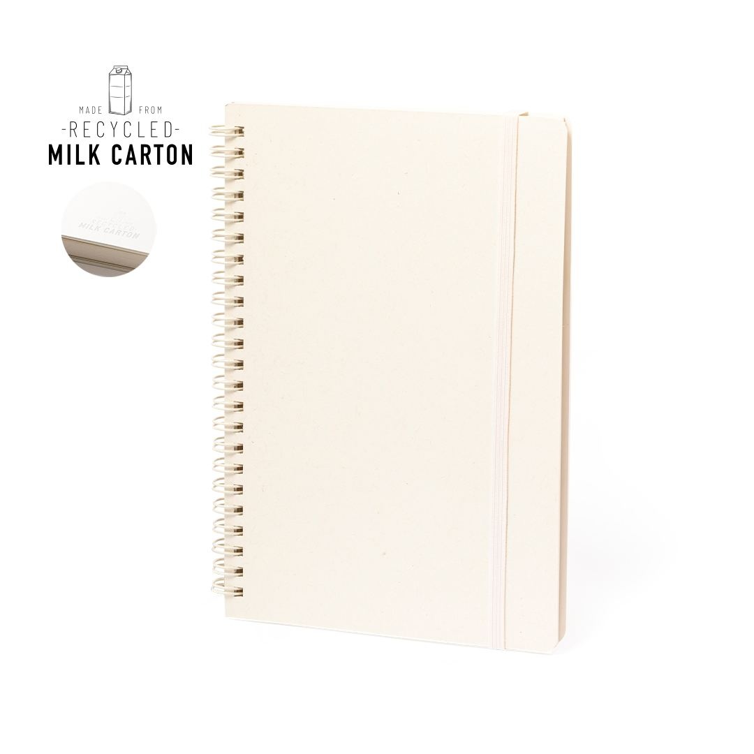 Livret à double anneaux métalliques A5 avec cpuvertures rigides fabriqués à partir de cartons de lait recyclés. Intérieur avec 80 feuilles de couleur naturelle à une bande microperforée et élastique de fermeture de couleur naturelle. Logo de Recycled Milk Carton sur la couverture et présenté dans un sac individuel recyclé.Les cartons de lait sont principalement constitués de carton et d’aluminium. Au cours de leur processus de recyclage, les différents matériaux de l’emballage sont séparés pour réutilisation et nouvelle utilisation, contribuant ainsi à parcourir le chemin infini de l’économie circulaire. Ce matériau se caractérise par son haut degré de recyclabilité, ainsi que par sa légèreté et sa résistance.