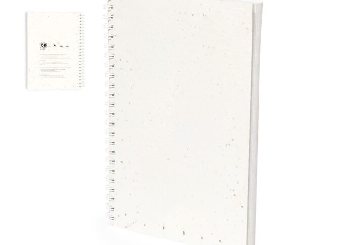 Cahier à couvertures souples avec couverture et dos en papier de graines. Avec 60 feuilles intérieures de couleur blanche lisse. comprend des graines de pétunia dans les deux couvertures, le transformant ainsi en papier plantable en fin de vie. Avec des instructions de plantation et présenté dans un sac individuel en papier recyclé.