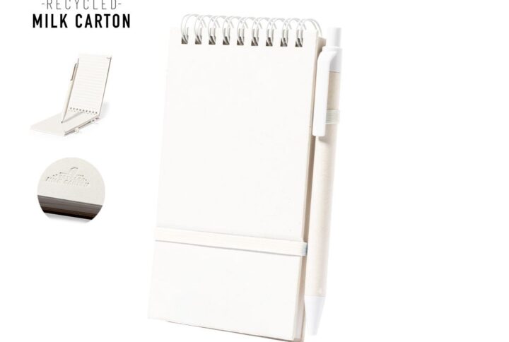 Ensemble de cahier et stylo à bille en fibre de café. Livret à double anneaux avec couvercles souples, fermeture élastique et support pour le stylo. De 70 feuilles et disposées à une bande. Stylo à bille à bouton-poussoir et encre bleue. Comprend la fibre de café Logo imprimé sur le carnet et le stylo. Présenté dans un sac individuel recyclé.La fibre de café est fabriquée à partir des déchets produits lors de la production du café. Une alternative durable qui favorise la réduction de l’utilisation des plastiques, économisant l’énergie dans le processus de fabrication et favorisant ainsi la protection de l’environnement.