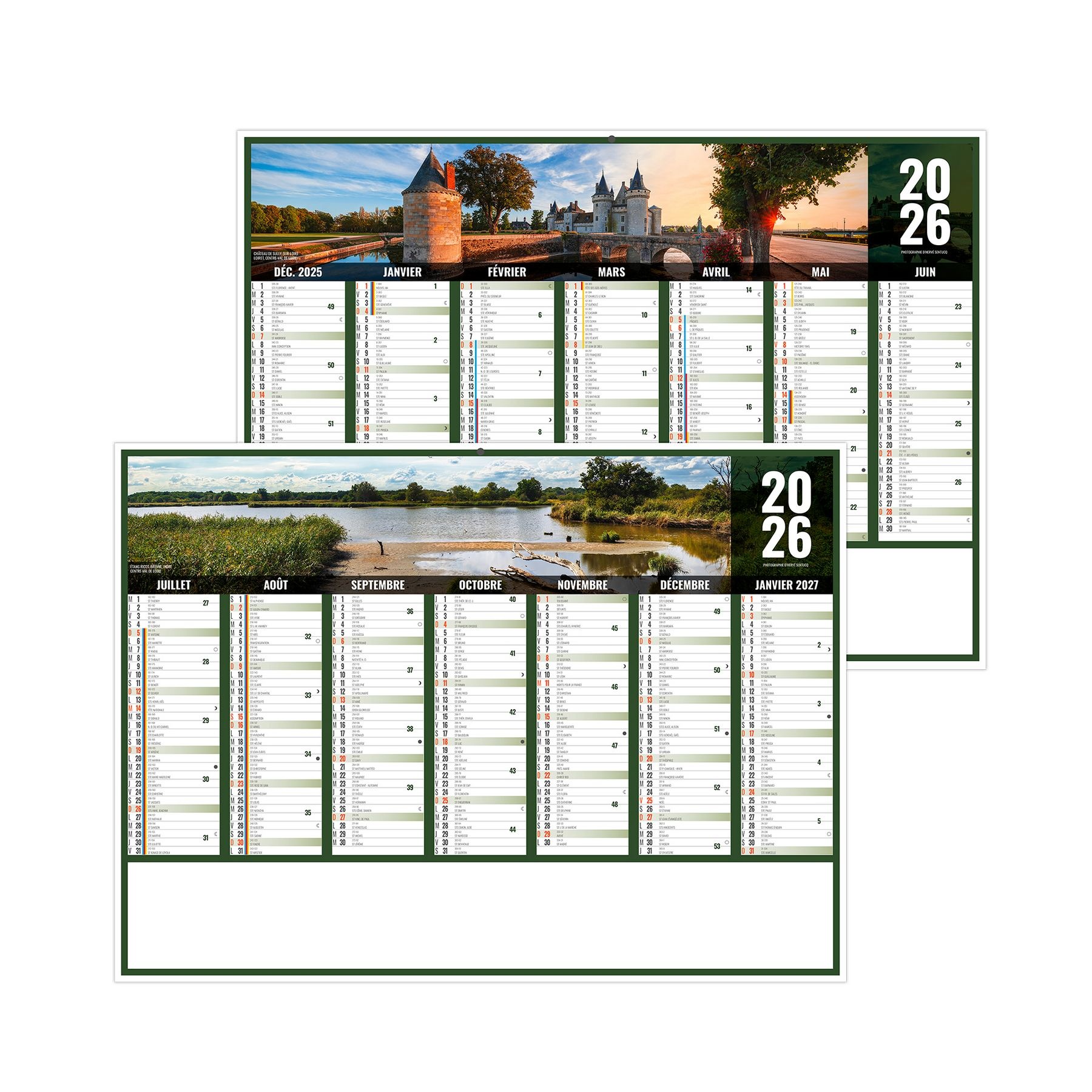 Calendrier 7 mois par face. La grille comprend les Saints, n° de semaines, phases lunaires, congés scolaires et le compte et décompte journalier. Photographie Vue panoramique sur le château de Sully sur loire dans le Loiret et l’étang Rico dans a Brenne, dans le centre Val de Loire. Photographies HERVÉ SENTUCQ. Repiquage La personnalisation est prévue dans la zone de repiquage qui se trouve dans la partie blanche. Impression recto-verso identique. Fichier à fournir par vos soins au format du repiquage en PDF sans fond perdu. Formats Disponible en 3 formats pour les contrecollés et en 4 formats pour les légers. Qualité Deux qualités possibles, en contrecollé (rigide, cartonné) ou en léger (souple). Papier couché satiné, qualité écriture finition MAT. Quantité Disponible à partir de 50 exemplaires pour le STANDARD CC et tous les LÉGERS SOUPLES et 100 exemplaires pour les MIDI CC et MINI CC. Délai 4 semaines pour les CC et 2 semaines pour les LÉGERS après accord du BAT. Réalisation du BAT (maquette, bon à tirer) sous 24 à 48 heures. Stock Toujours disponible.