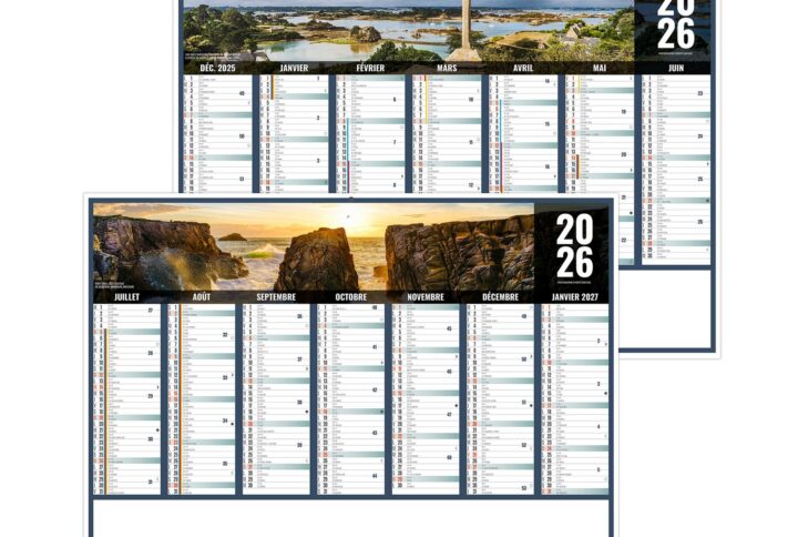 Calendrier 7 mois par face. La grille comprend les Saints, n° de semaines, phases lunaires, congés scolaires et le compte et décompte journalier. Photographie Vue panoramique sur le château de Sully sur loire dans le Loiret et l’étang Rico dans a Brenne, dans le centre Val de Loire. Photographies HERVÉ SENTUCQ. Repiquage La personnalisation est prévue dans la zone de repiquage qui se trouve dans la partie blanche. Impression recto-verso identique. Fichier à fournir par vos soins au format du repiquage en PDF sans fond perdu. Formats Disponible en 3 formats pour les contrecollés et en 4 formats pour les légers. Qualité Deux qualités possibles, en contrecollé (rigide, cartonné) ou en léger (souple). Papier couché satiné, qualité écriture finition MAT. Quantité Disponible à partir de 50 exemplaires pour le STANDARD CC et tous les LÉGERS SOUPLES et 100 exemplaires pour les MIDI CC et MINI CC. Délai 4 semaines pour les CC et 2 semaines pour les LÉGERS après accord du BAT. Réalisation du BAT (maquette, bon à tirer) sous 24 à 48 heures. Stock Toujours disponible.