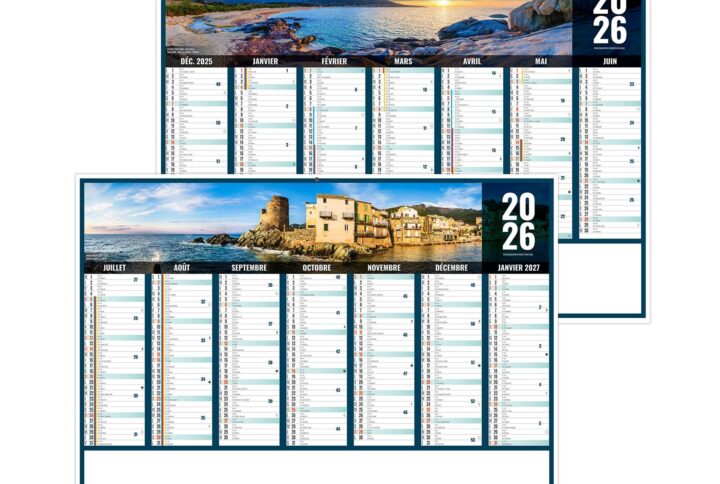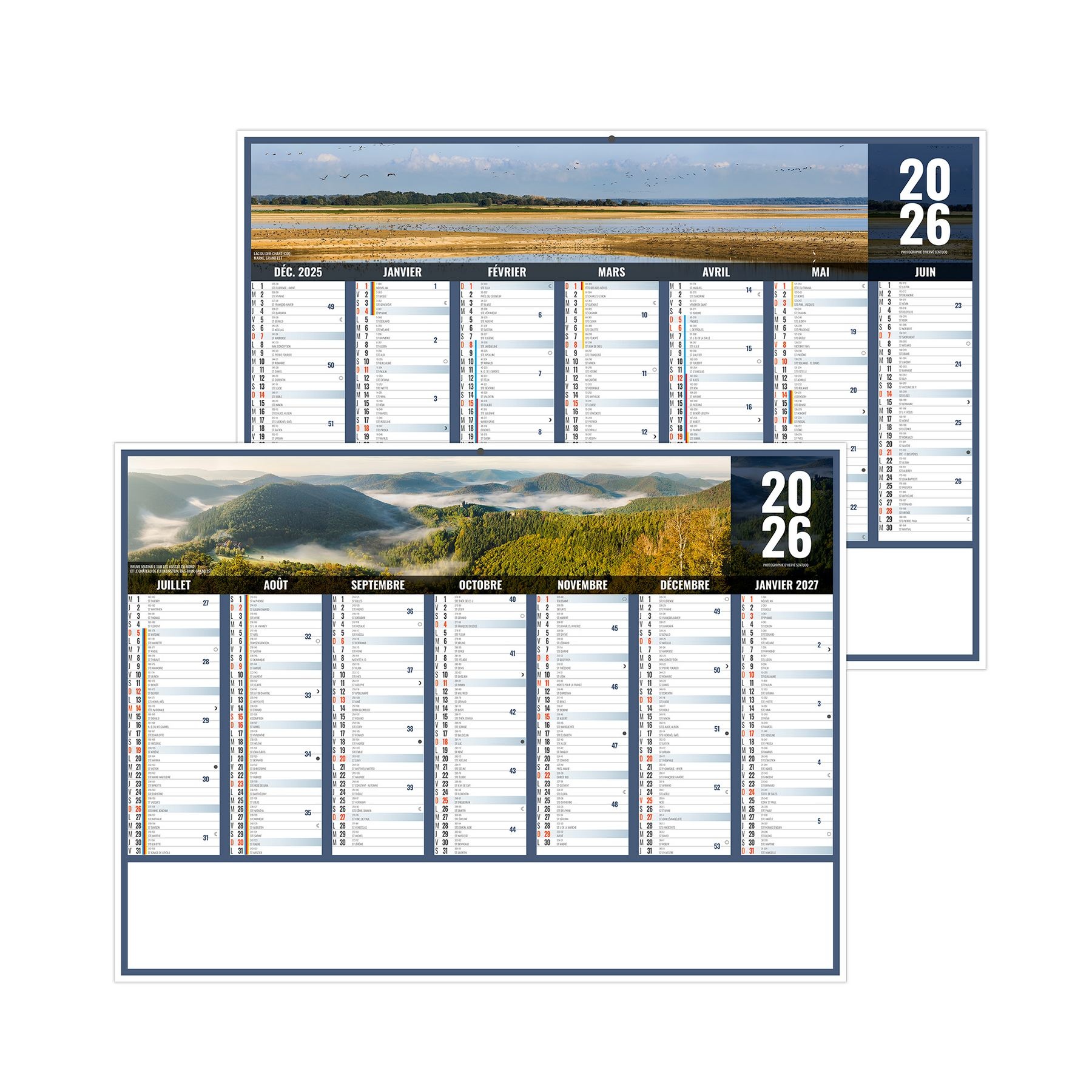 Calendrier 7 mois par face. La grille comprend les Saints, n° de semaines, phases lunaires, congés scolaires et le compte et décompte journalier. Photographie Vous aimez la Marne, les Vosges? Alors venez découvrir notre modèle de calendrier bancaire publicitaire 2026 Liberté Grand-Est, nous vous emmenons découvrir le lac du Der Chantecoq dans la Marne et les brumes matinales des Vosges du Nord dans lesquelles se révèle le château de Feckeinstein au loin. Photographies HERVÉ SENTUCQ. Repiquage La personnalisation est prévue dans la zone de repiquage qui se trouve dans la partie blanche. Impression recto-verso identique. Fichier à fournir par vos soins au format du repiquage en PDF sans fond perdu. Formats Disponible en 3 formats pour les contrecollés et en 4 formats pour les légers. Qualité Deux qualités possibles, en contrecollé (rigide, cartonné) ou en léger (souple). Papier couché satiné, qualité écriture finition MAT. Quantité Disponible à partir de 50 exemplaires pour le STANDARD CC et tous les LÉGERS SOUPLES et 100 exemplaires pour les MIDI CC et MINI CC. Délai 4 semaines pour les CC et 2 semaine pour les LÉGERS après accord du BAT. Réalisation du BAT (maquette, bon à tirer) sous 24 à 48 heures. Stock Toujours disponible.