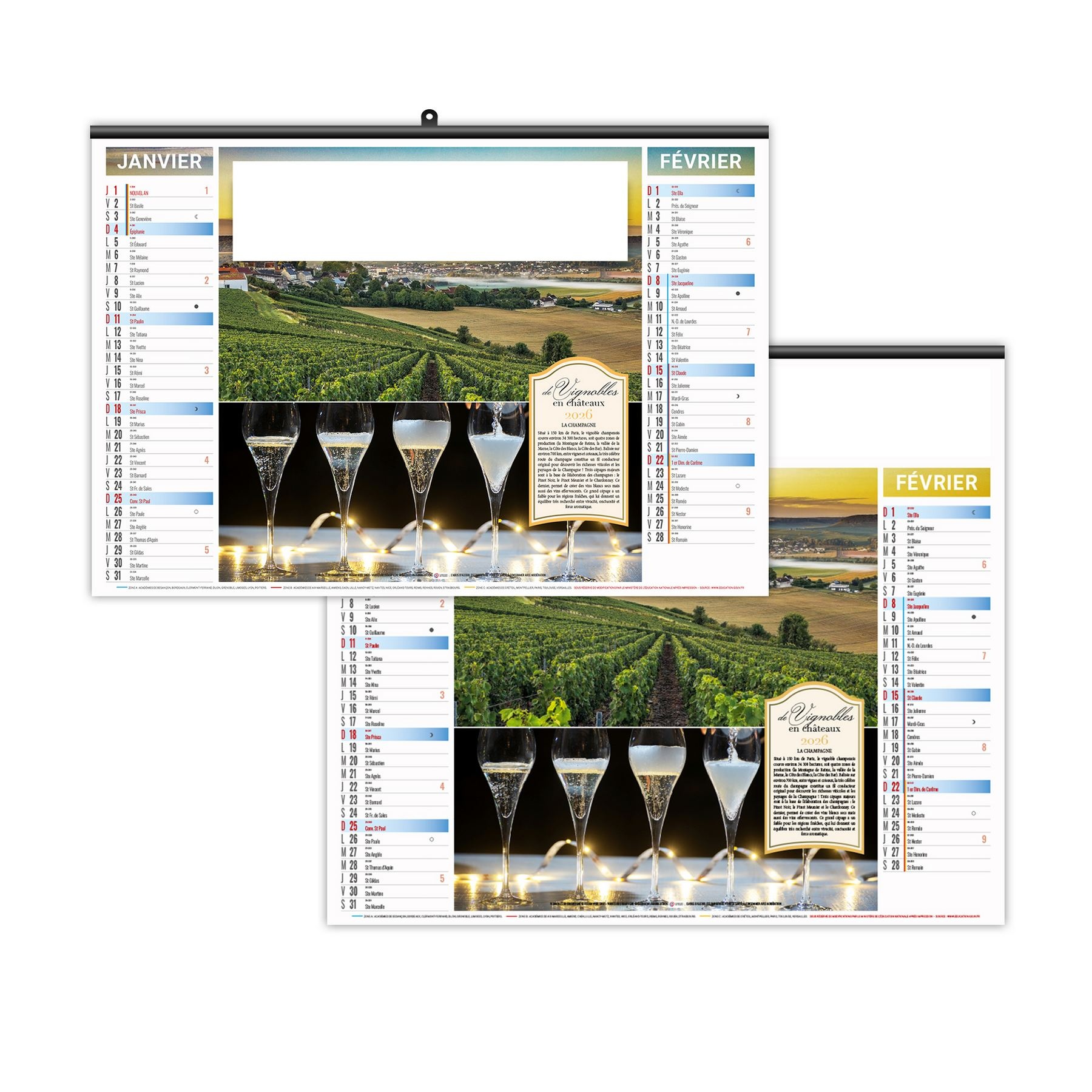 Calendrier 2 mois par page. La grille comprend les jours, les mois, les numéros de semaines et les jours fériés. Crédit Photographique En 2019, la France a produit 4,2 milliards de litres de vin soit 17 % de la production mondiale. Cet illustré éco vous présente les principaux vignobles de France et la composition de chaque appellation. Photographies Adobe stock. Repiquage La personnalisation est prévue dans la zone de repiquage qui se trouve dans la partie blanche en haut de chaque feuillet. Fichier à fournir par vos soins au format du repiquage XXL 460 X 65 mm ou SMALL 280 X 70 mm en PDF sans fond perdu. Formats XXL : 480x 420 mm ou au format SMALL : 480 x 330 mm. Qualité Papier 135 g/m2 satin Quantité à partir de 25 exemplaires. Délai 2 semaines après accord du BAT. Réalisation du BAT (Maquette, bon à tirer) sous 24 à 48 heures. Stock Toujours disponible.