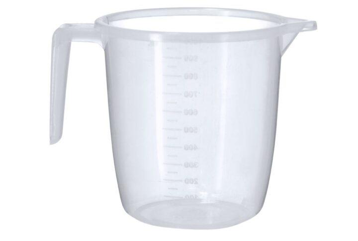 Pichet mesureur 1L fabriqué en PP transparent résistant avec poignée. Avec une jauge latérale de 50ml et verrou sur le bord pour éviter les déversements.