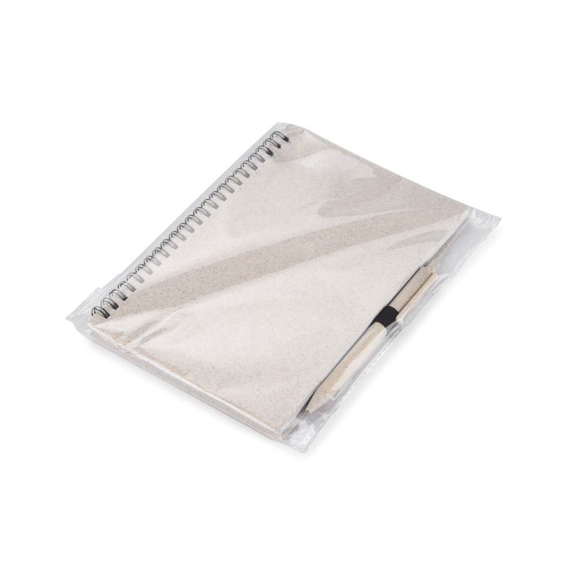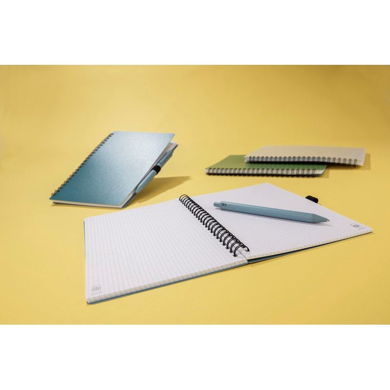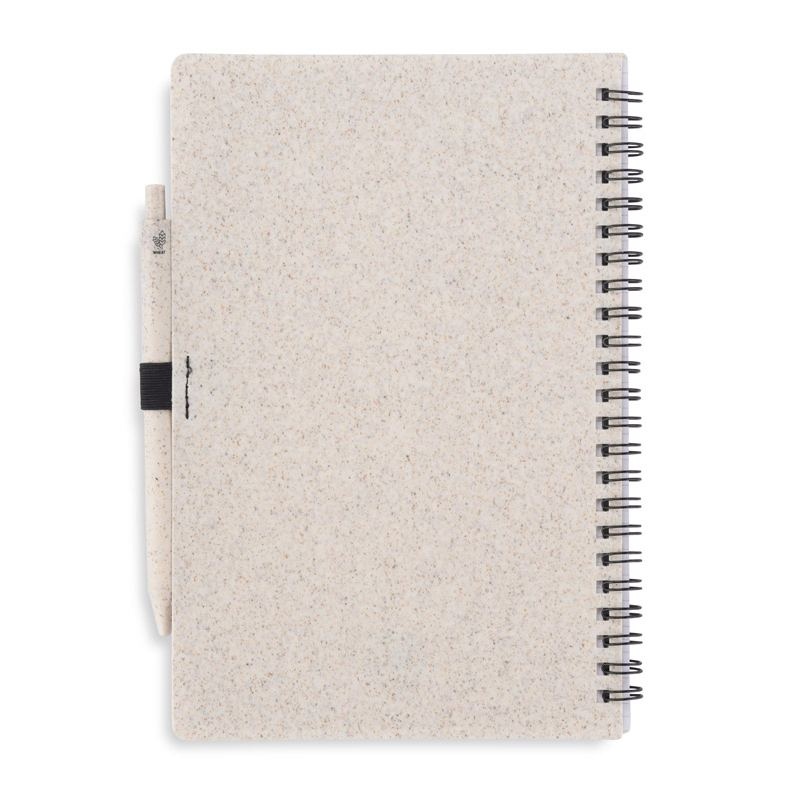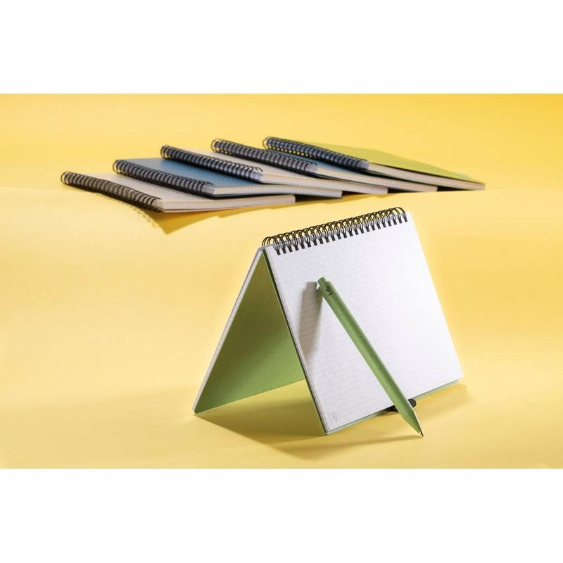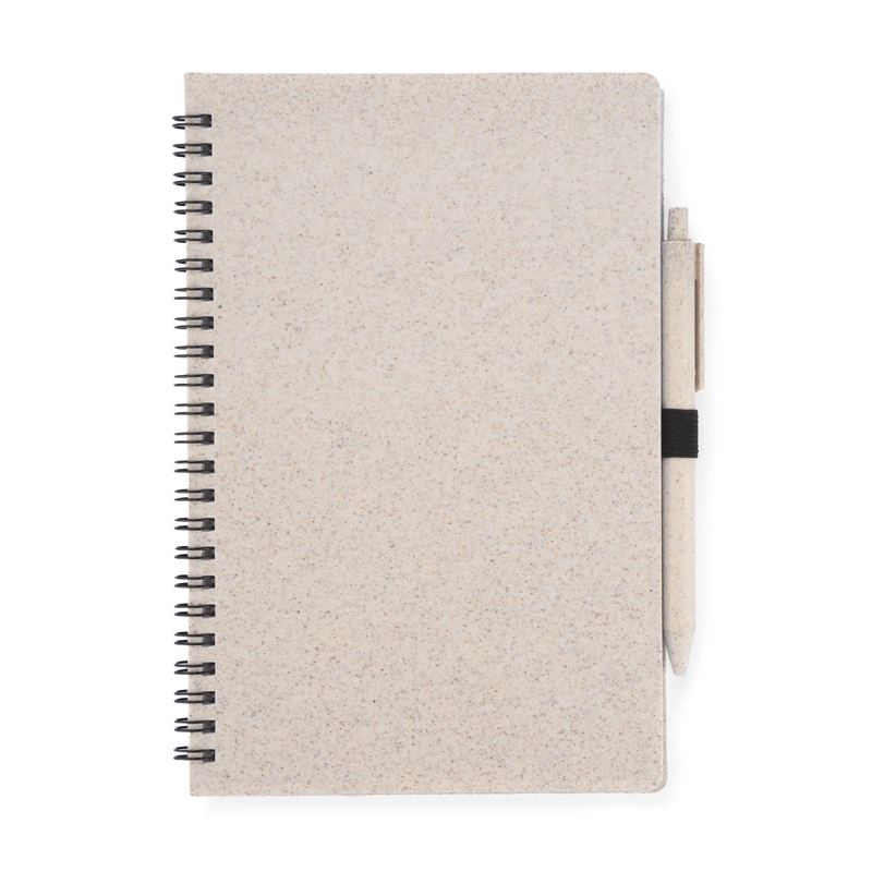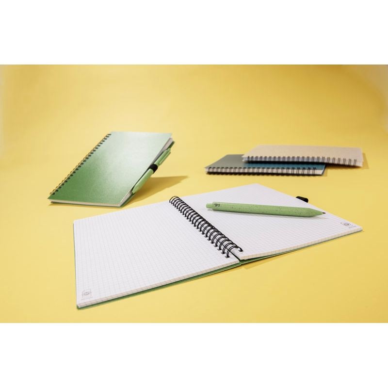 Carnet TRESA avec stylo, couleurs assorties à la couverture. Le stylo et la couverture du carnet sont en paille de blé. Un cahier à spirale de 70 feuilles quadrillées en papier recyclé. Format A5. Recharge pour stylo bleu.