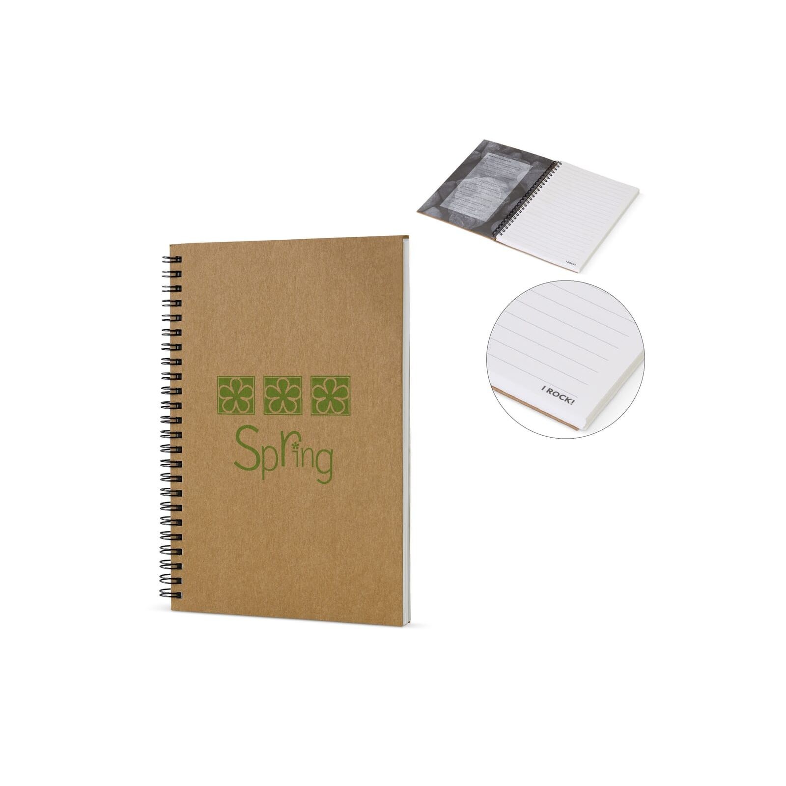 Les feuilles de ce cahier ont été fabriquées à partir de roches. Le résultat est une feuille de papier forte et lisse avec un toucher remarquablement frais. Les feuilles sont perforées sur le côté, ce qui facilite leur détachement.