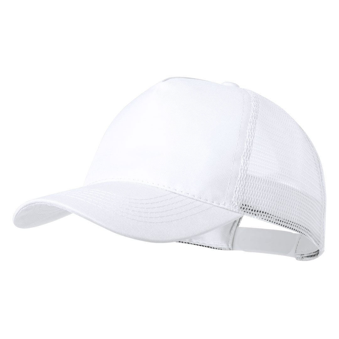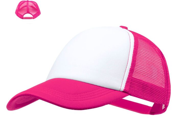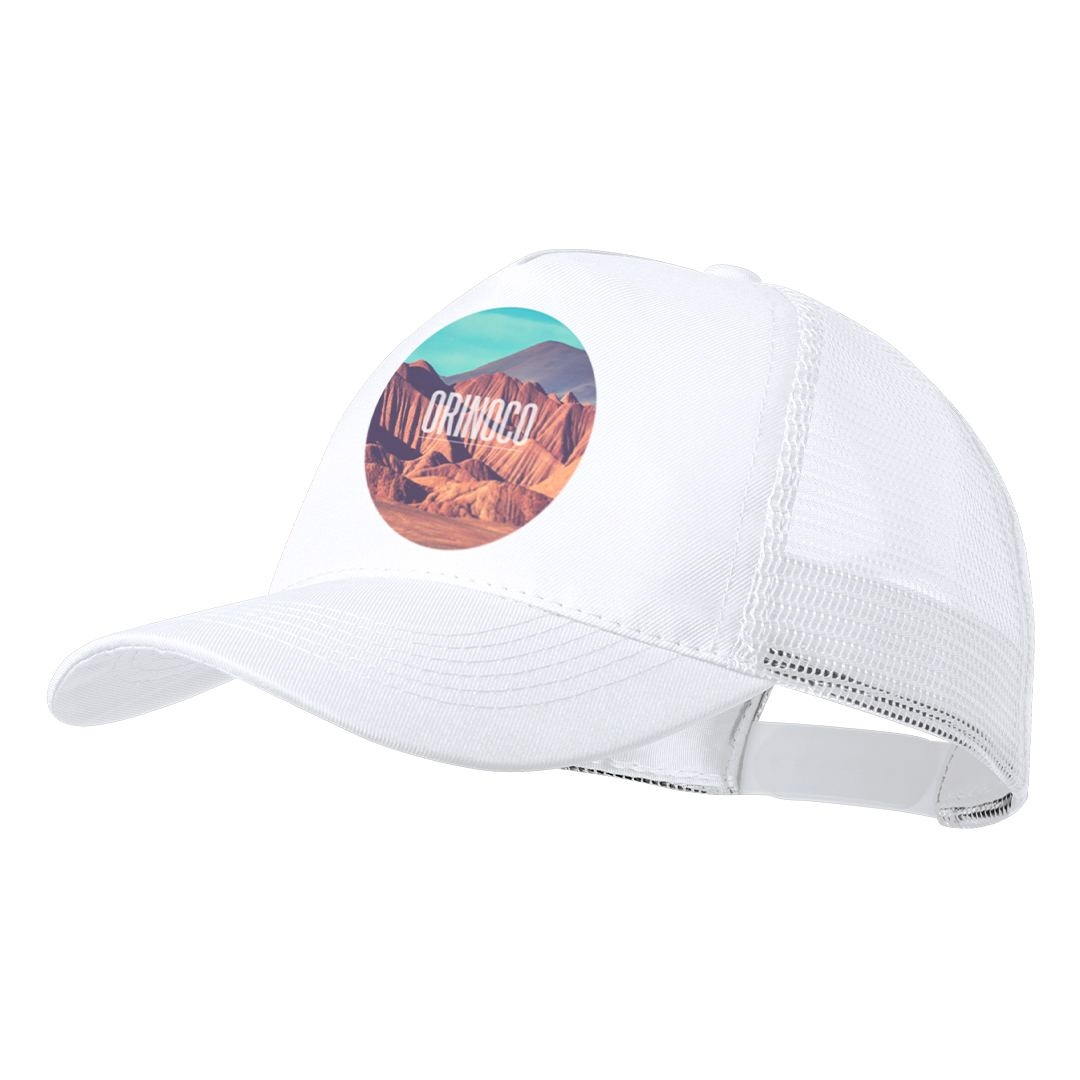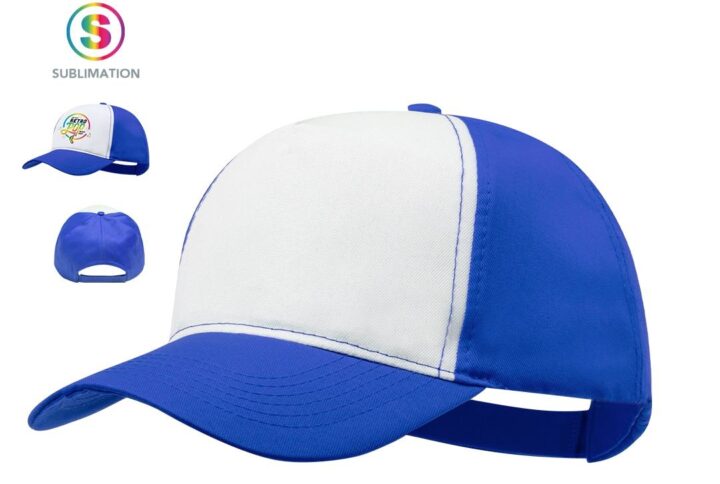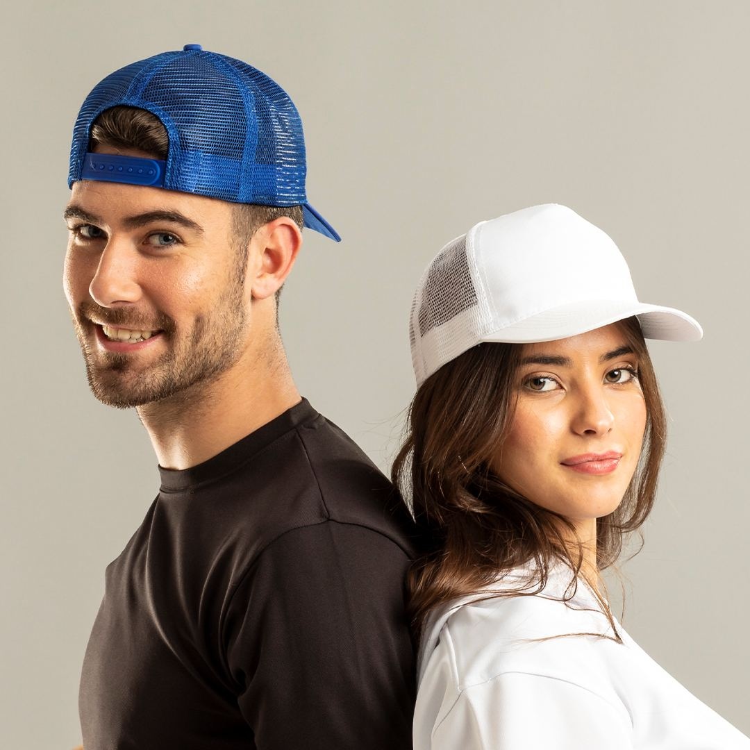 Casquette en polyester à 5 panneaux avec tissu en maille et fermeture réglable. Disponible dans une large gamme de couleurs (couleur blanche spécialement fabriquée pour l’impression par sublimation).
