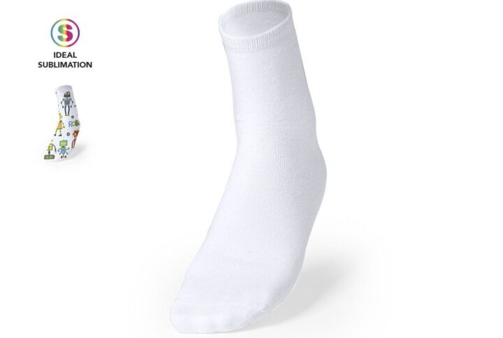 Paire de chaussettes en polyester blanc et spécialement conçues pour le marquage par sublimation. En taille L-XL.