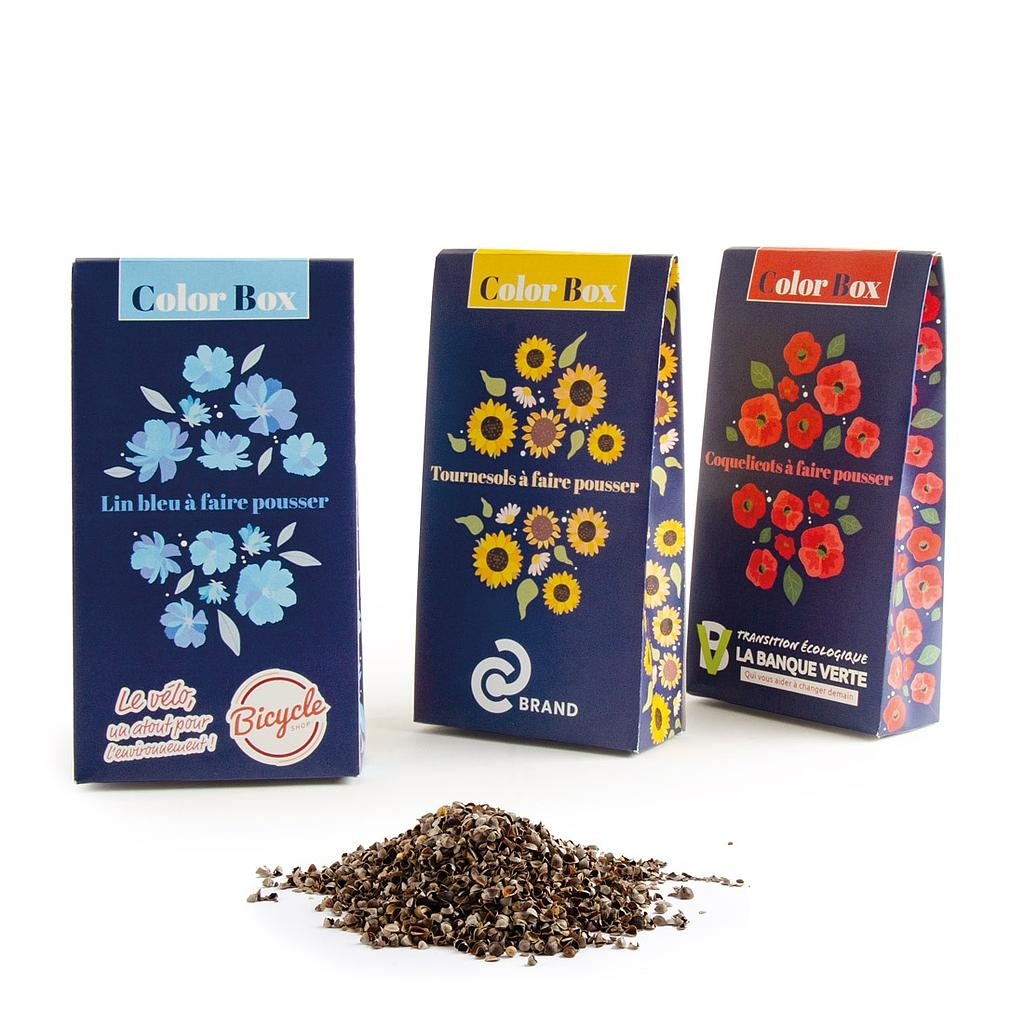 Contenu de la Color Box : Cette boîte personnalisée, imprimée en quadrichromie, renferme un mélange de graines à semer accompagnées de cosses de sarrasin. Ces cosses aèrent le semis et encouragent la croissance des fleurs, favorisant ainsi un environnement 100 % nature et chatoyant.