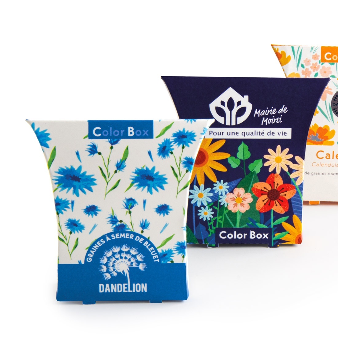 Contenu de la mini Color Box : Boîte 7,5 x 7,5 x 2,5 cm, contient 3 grammes de graines à semer, ainsi que 2 grammes de cosses de sarrasin pour aérer le semis et favoriser la pousse. Vous pouvez personnaliser la boîte avec votre communication grâce à une impression en quadrichromie.