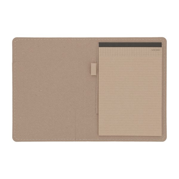 Conférencier A5 avec bloc (papier recyclé 70 gr./m²) ligné de 20 pages. Passant pour stylo. Poche rabat intérieure. Matière biodégradable : logo “be green” pré-imprimé au dos en bas à droite.