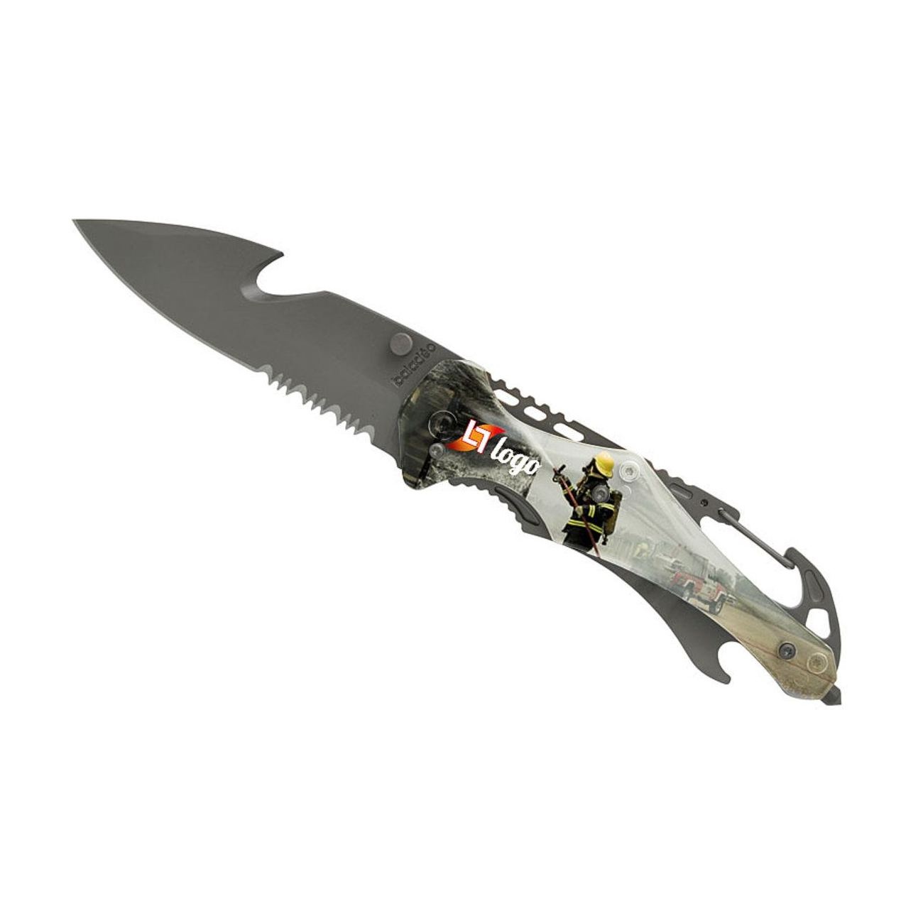 Couteau pliant avec lame en acier inoxydable 420 avec revêtement titane composée d’une partie de lame fine (pour les coupes précises) et d’une partie microdentée (pour les coupes difficiles). Manche en plastique transparent. Ouverture/fermeture une main avec cran de sécurité de type Liner lock. Assemblage vissé Torx. Fonctions coupe-ceinture/coupe-corde sur la lame et marteau brise-vitre en carbure de tungstène à l’arrière du manche. Décapsuleur, mousqueton d’accroche et clip de ceinture. Livré dans un étui gris chiné en RPET.