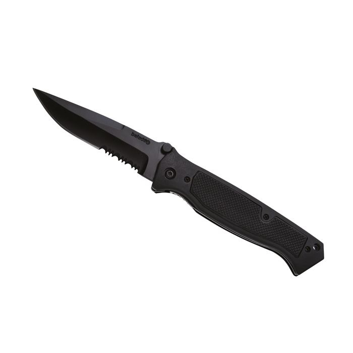 Couteau pliant avec lame noire en acier inoxydable 420 composée d’une partie de lame fine (pour les coupes précises) et d’une partie microdentée (pour les coupes difficiles). Manche en ABS avec insert caoutchouc. Ouverture/fermeture une main avec cran de sécurité de type Liner lock. Passant pour corde à l’arrière du manche. Clip de ceinture. Livré dans un étui gris chiné en RPET.
