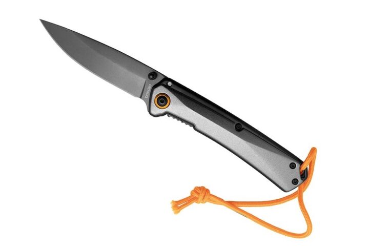 Couteau pliant avec lame satinée en acier inoxydable 420. Manche en aluminium anodisé kaki foncé. Ouverture une main avec système ‘flipper’ et fermeture avec cran de sécurité de type Liner lock. Assemblage vissé Torx. Trou pour anneau ou cordelette et clip de ceinture. Livré dans un étui gris chiné en RPET.