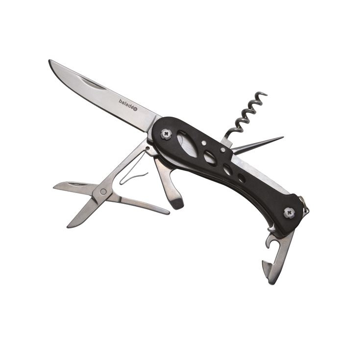 Eléments entièrement en acier inoxydable hautement résistant (2CR13). Manche en stamina noir. 2 mitres forgées en acier inoxydable. Ressort guilloché. 7 fonctions : couteau, décapsuleur, ouvre-boîte, tournevis cruciforme, 2 tournevis plats, tire-bouchon en acier inoxydable. Livré dans un étui gris chiné en RPET.