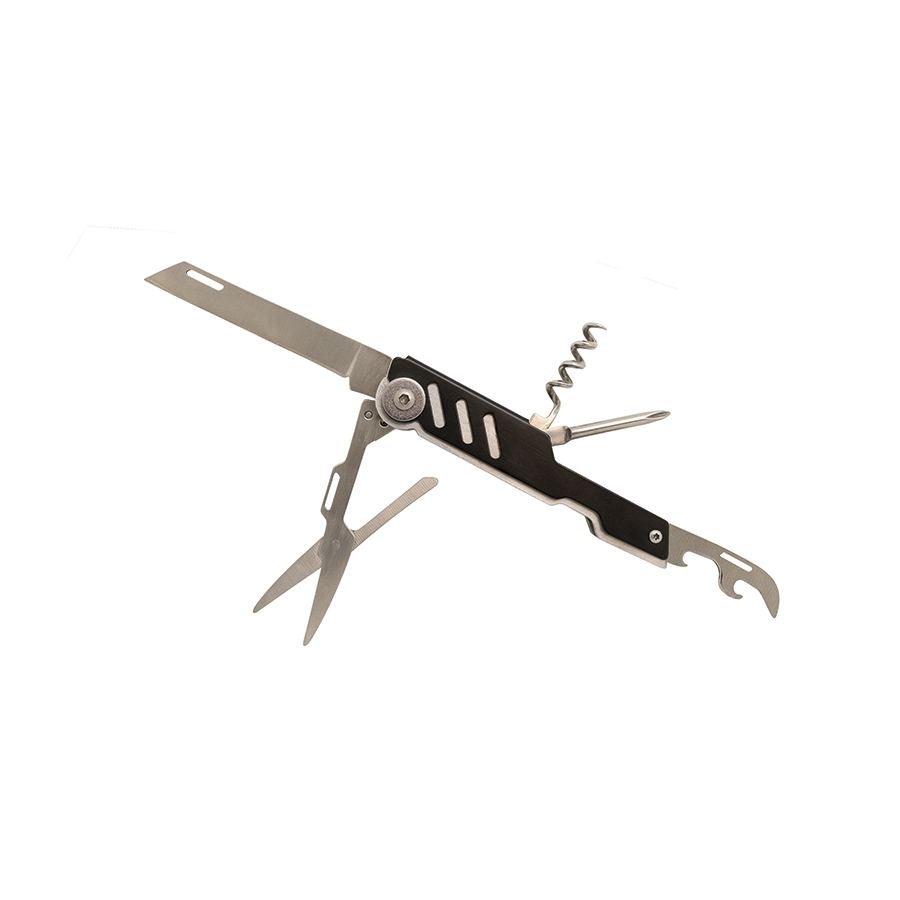 Eléments entièrement en acier inoxydable hautement résistant (2CR13). Manche en aluminium. Assemblage vissé Torx. 6 fonctions : couteau, décapsuleur, ouvre boite, tournevis cruciforme, ciseaux, tire-bouchon avec mèche 4 spirales. Trou pour anneau ou cordelette. Livré dans un étui gris chiné en RPET.