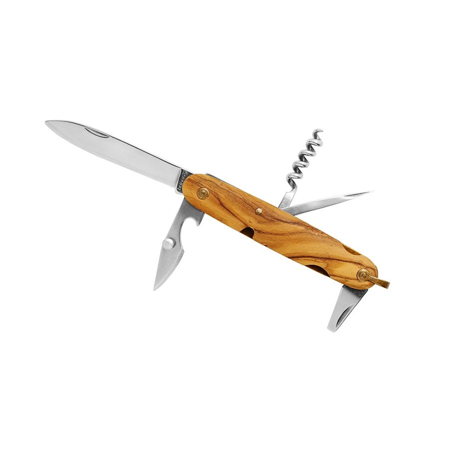 Eléments entièrement en acier inoxydable hautement résistant (2CR13). Manche en bois d’olivier. Assemblage riveté. 6 fonctions : couteau, petite lame canif, décapsuleur, tournevis plat 4 mm, poinçon, tire-bouchon avec mèche 5 spirales. Bélière en laiton. Livré dans un étui gris chiné en RPET.