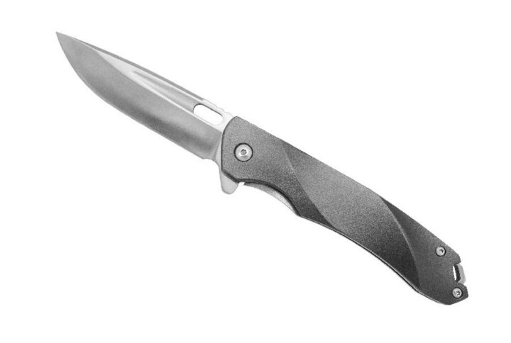 Couteau pliant avec lame en acier inoxydable 420 avec revêtement titane. Manche en aluminium anodisé. Ouverture/fermeture une main avec cran de sécurité de type Liner lock. Assemblage vissé Torx. Trou pour anneau ou cordelette et clip de ceinture. Livré dans un étui gris chiné en RPET.