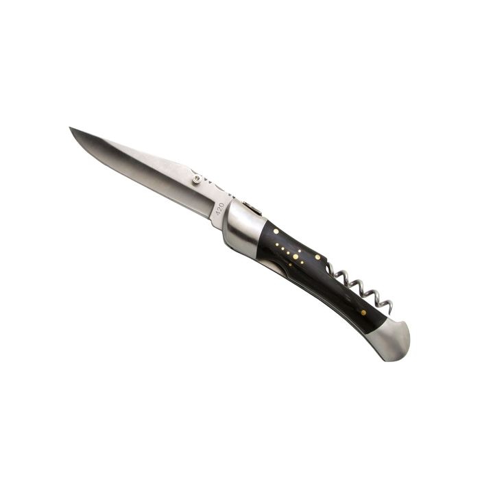 Couteau pliant avec lame en acier inoxydable 420. Manche en stamina noir. Ressort guilloché. 2 mitres forgées en acier brossé inoxydable. Tire-bouchon avec mèche 4 spirales en acier inoxydable. Ouverture/fermeture une main avec cran de sécurité de type Liner lock. Livré dans un étui de ceinture en nylon 420D gris chiné.