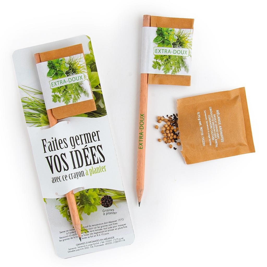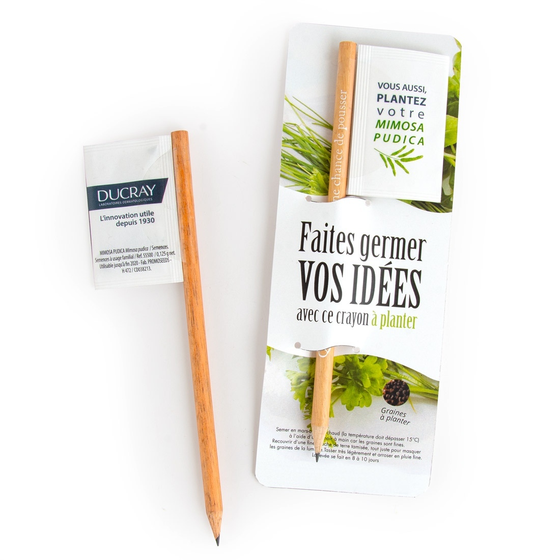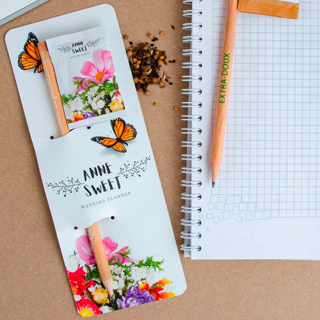 Ce crayon en bois brut, mesurant 175 mm de longueur avec une tête coupée, est accompagné d’un sachet de graines personnalisable de 62 x 80 mm. Vous avez la liberté de choisir les graines que vous préférez pour personnaliser ce cadeau 100 % nature. De plus, il est livré dans une carte personnalisée en quadrichromie recto au format 200 x 75 mm, offrant ainsi une belle surface pour mettre en avant votre communication.