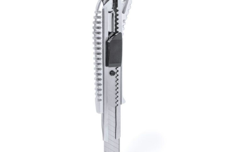 Cutter en acier inoxydable avec lame fine et clip de fixation. Embout amovible pour régler la longueur de la lame.