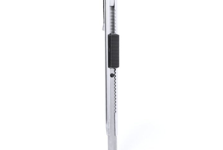 Cutter en PS de finition translucide. Avec un mécanisme poussoir de rétraction automatique et une lame en acier de 6 x 1,9 cm, sans système de verrouillage (stopper).