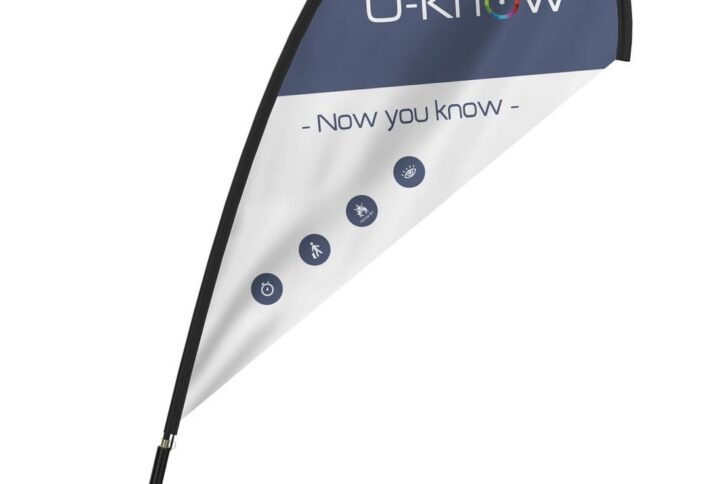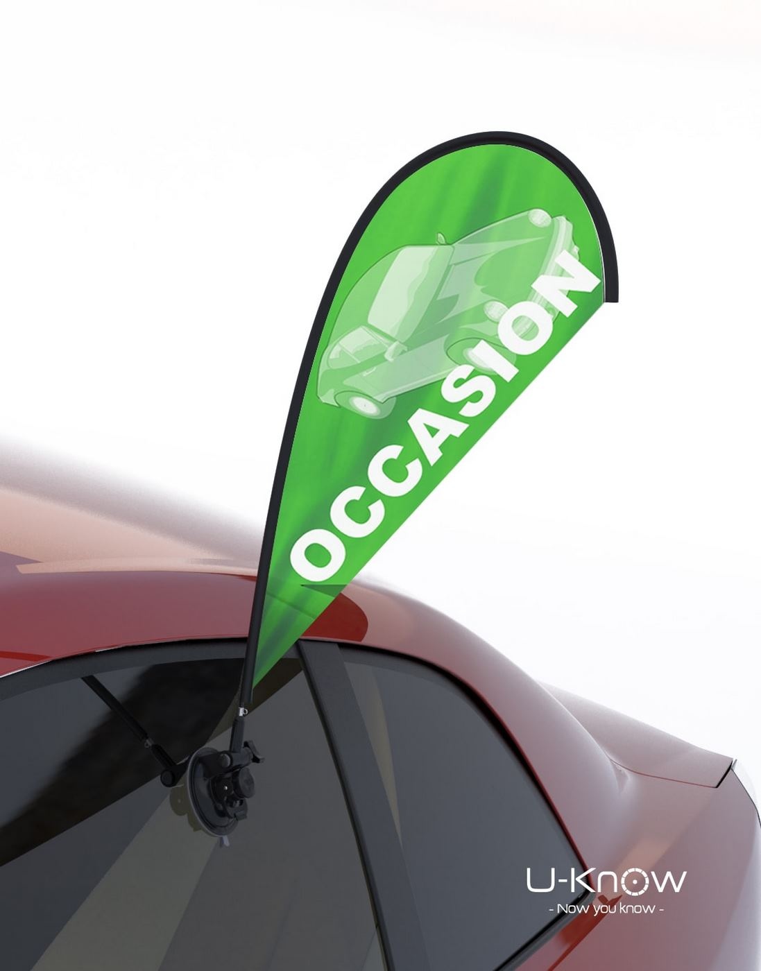 Oriflamme, goutte d’eau de format 24x59cm. Fixation du mât par ventouse, angle de fixation ajustable. Matière 100% polyester 115g/m². Impression quadri sublimation numérique sur le recto seulement. Impression traversée visible des 2 côtés. Mât en fibre de verre.