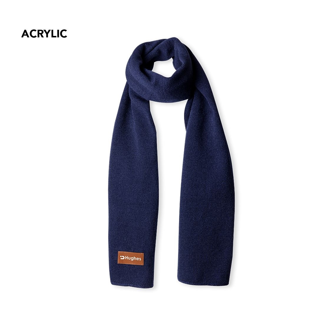 Écharpe unisexe en matériau acrylique élastique. Avec écusson en similicuir cousu pour le marquage et disponible dans une large gamme de couleurs.