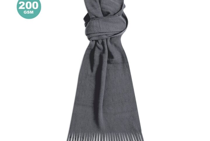 Écharpe unisexe en matériau acrylique élastique. Avec écusson en similicuir cousu pour le marquage et disponible dans une large gamme de couleurs.