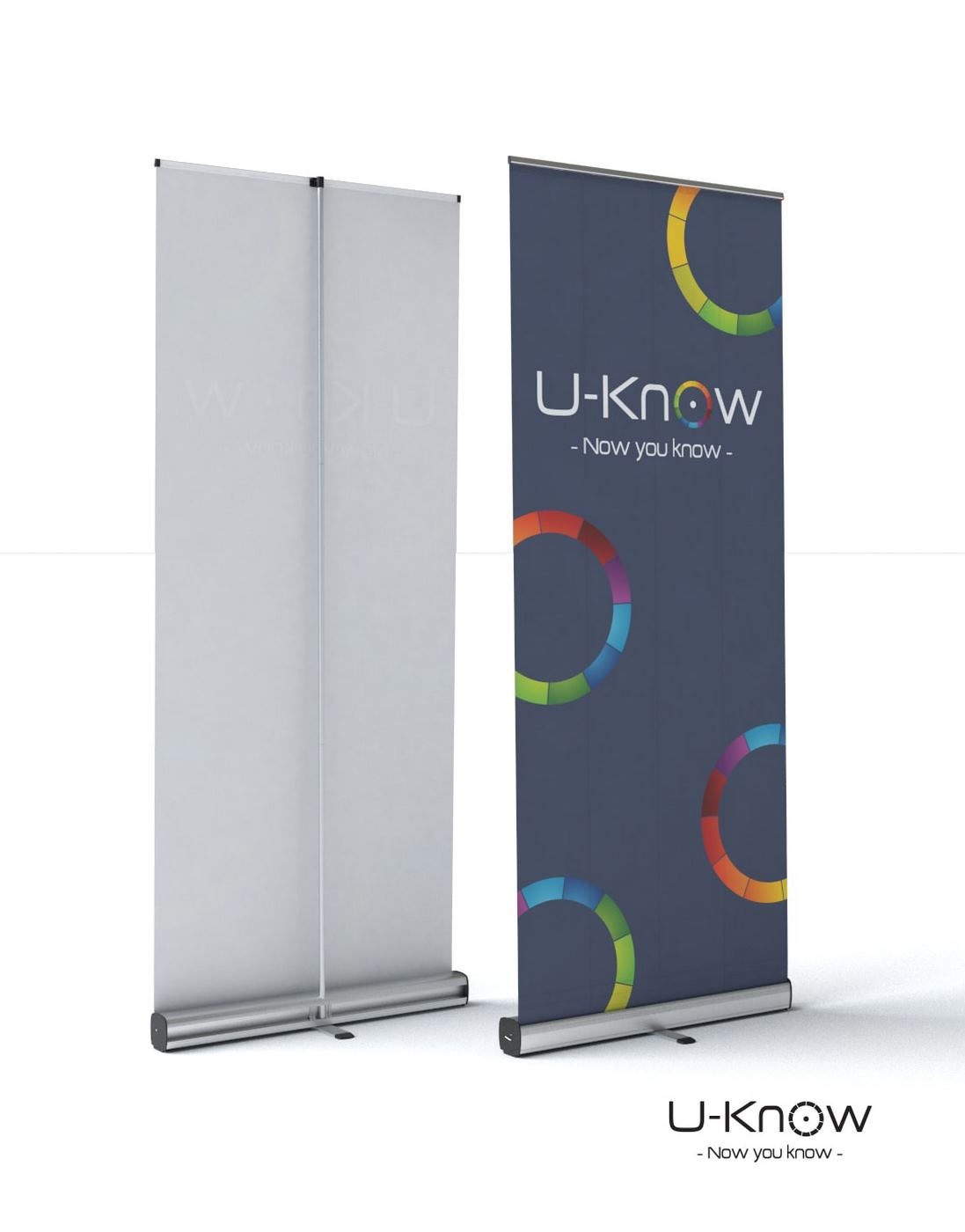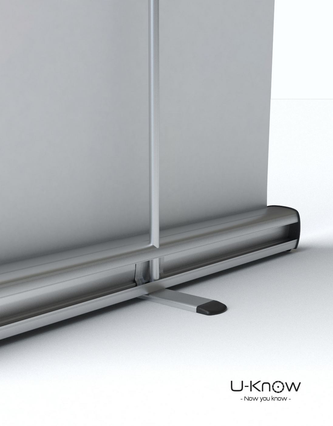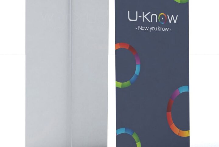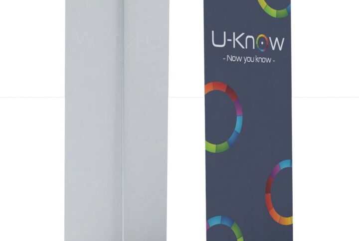 Kakémono publicitaire de type rollup. Mât en métal finition aluminium avec renfort. Affiche imprimée en France sur bâche PVC 440g/m² norme anti-feu européenne B1.