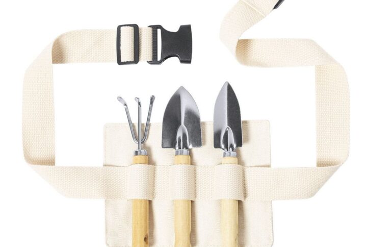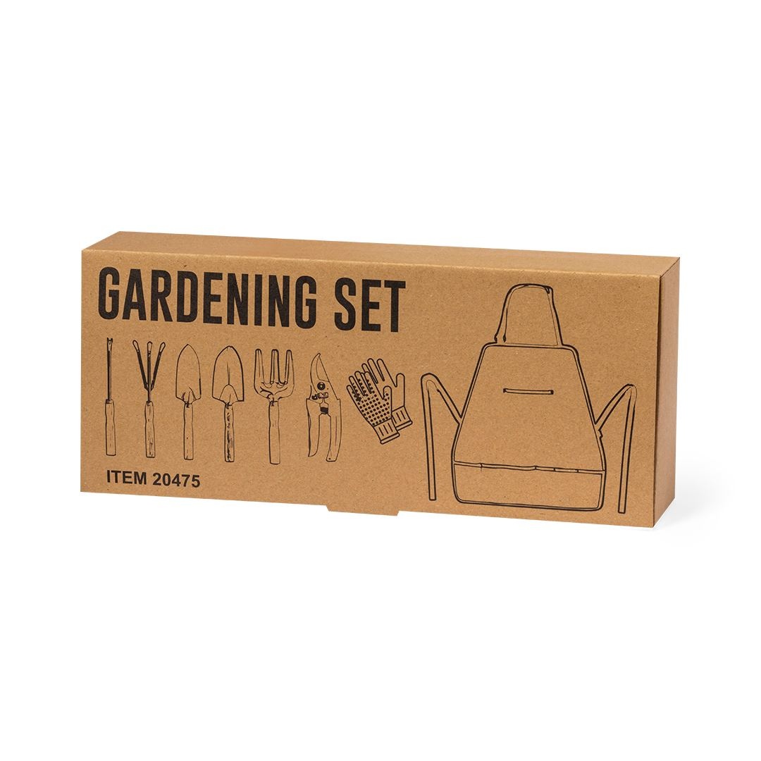 Ensemble complet de jardinage avec 7 accessoires et tablier réglable avec poches. Il comprend 2 pelles de différentes tailles, deux râteaux, un poinçon, des ciseaux et des gants pour protéger les mains. Présenté dans une boîte de conception kraft.