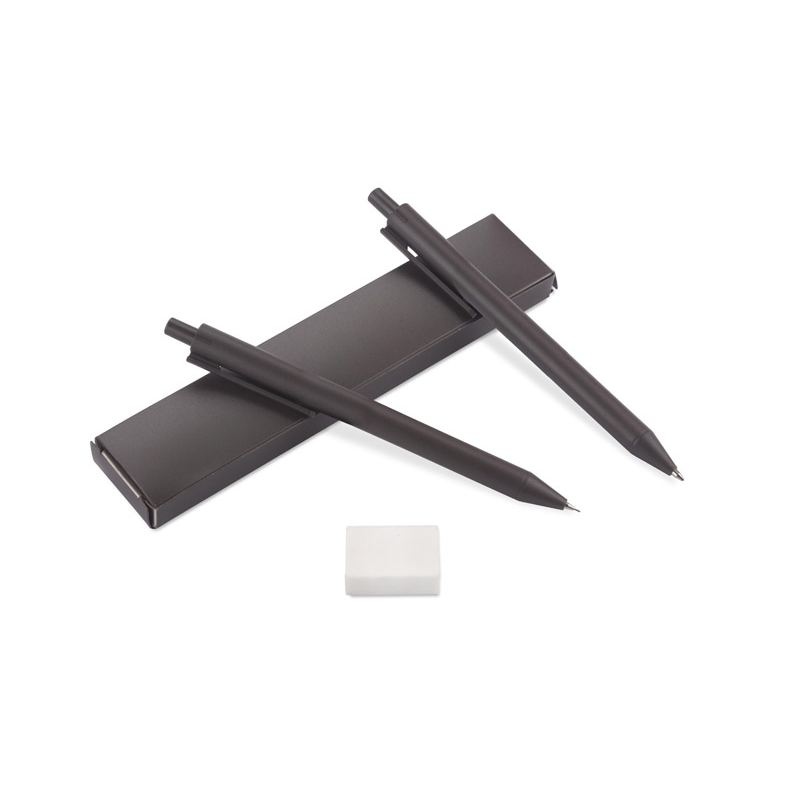 Le coffret KOPIKO est composé d’un stylo, d’un porte-mine et d’une règle en plastique contenant des grains de café et une gomme classique.
