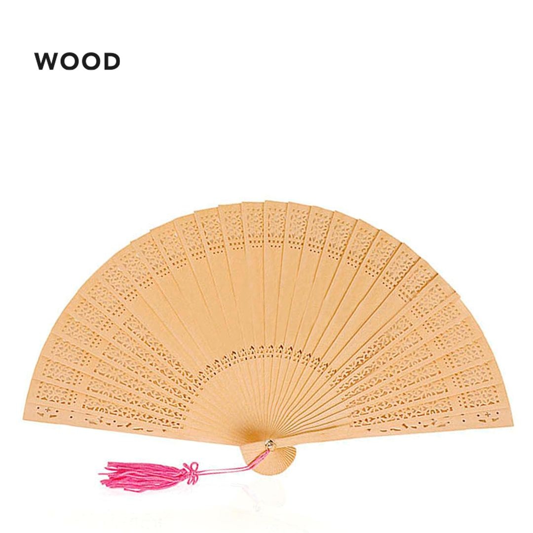 Eventail en bois naturel ajouré avec ruban à pompon. Présenté dans une boîte individuelle.
