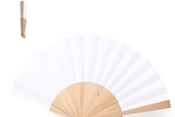 Eventail en bois naturel ajouré avec ruban à pompon. Présenté dans une boîte individuelle.
