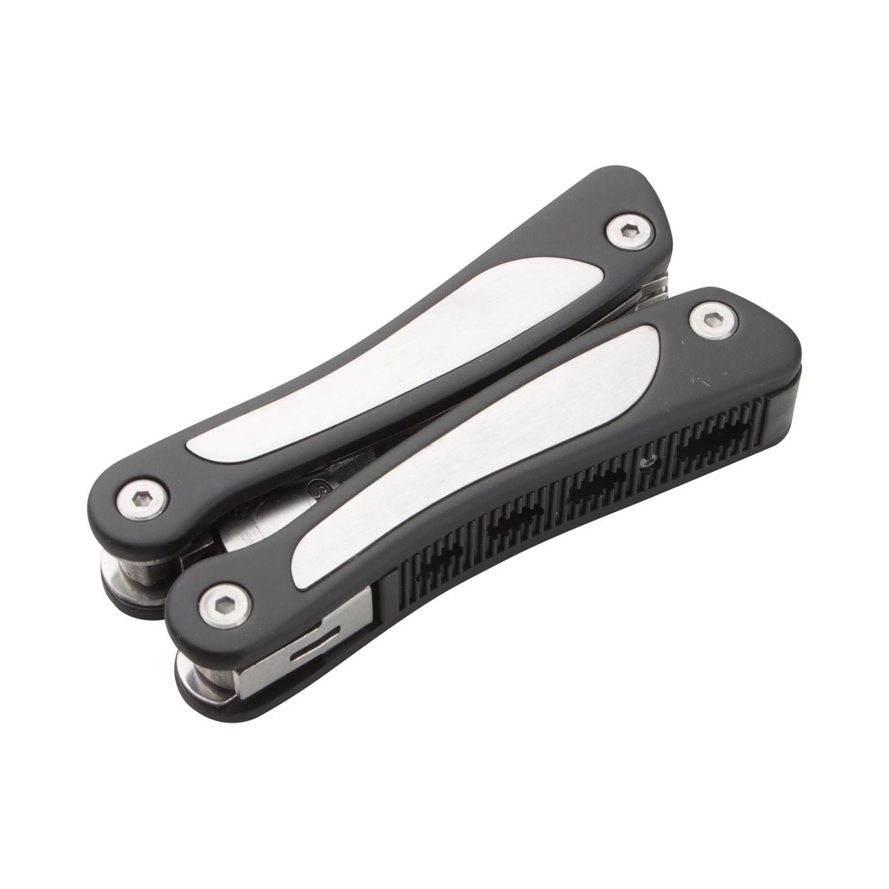 Pince en inox avec 9 fonctions (pince, lime, 3 tournevis, 2 lames couteau, ouvre-boîte et scie) dans pochette en polyester.