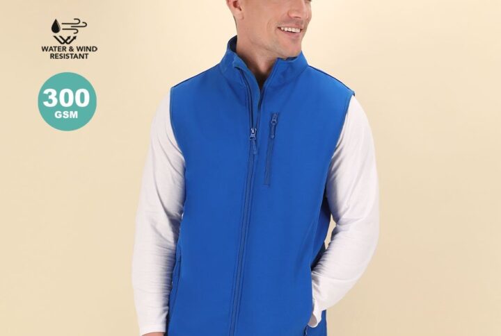 Gilet sans manches RPET Soft Shell en 3 couches, 340 g/m². Avec membrane de 8000 mm, imperméable et respirante. Extérieur en Soft Shell et intérieur en micro-polaire noire. Avec poche extérieure sur la poitrine droite et deux poches latérales zippées. Avec zip central et zips inversés sur les poches, incluant des tirettes noires. Protège-menton assorti et taille ajustable avec bande élastique et stoppeur. Étiquette RPET sur le bord du vêtement.