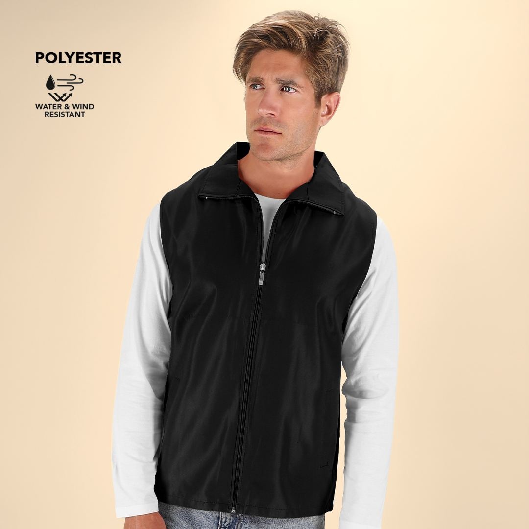 Gilet unisexe en tissu léger et respirant avec doublure en maille blanche. Fermeture à glissière avant assortie et tirette argentée, avec une poche extérieure de chaque côté.