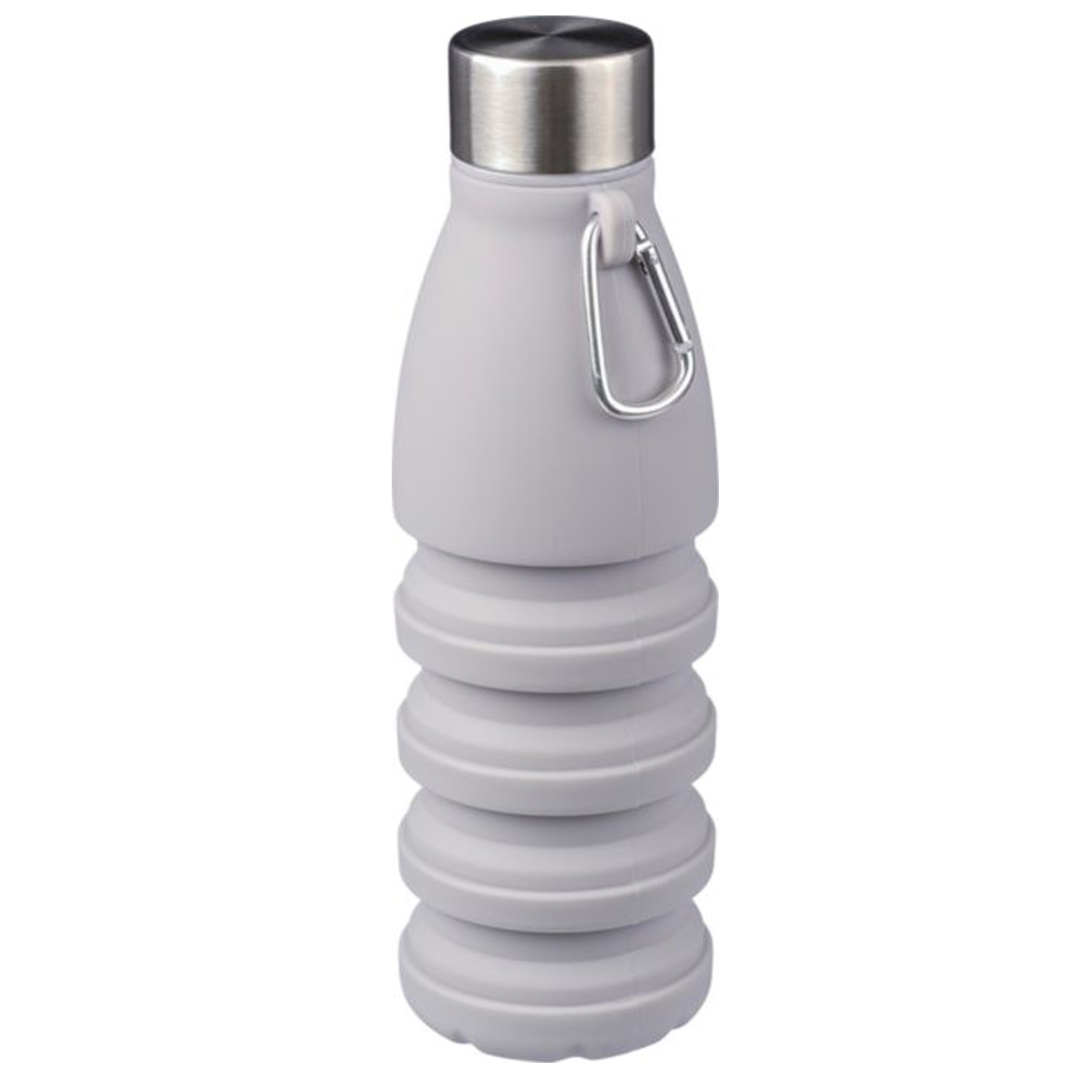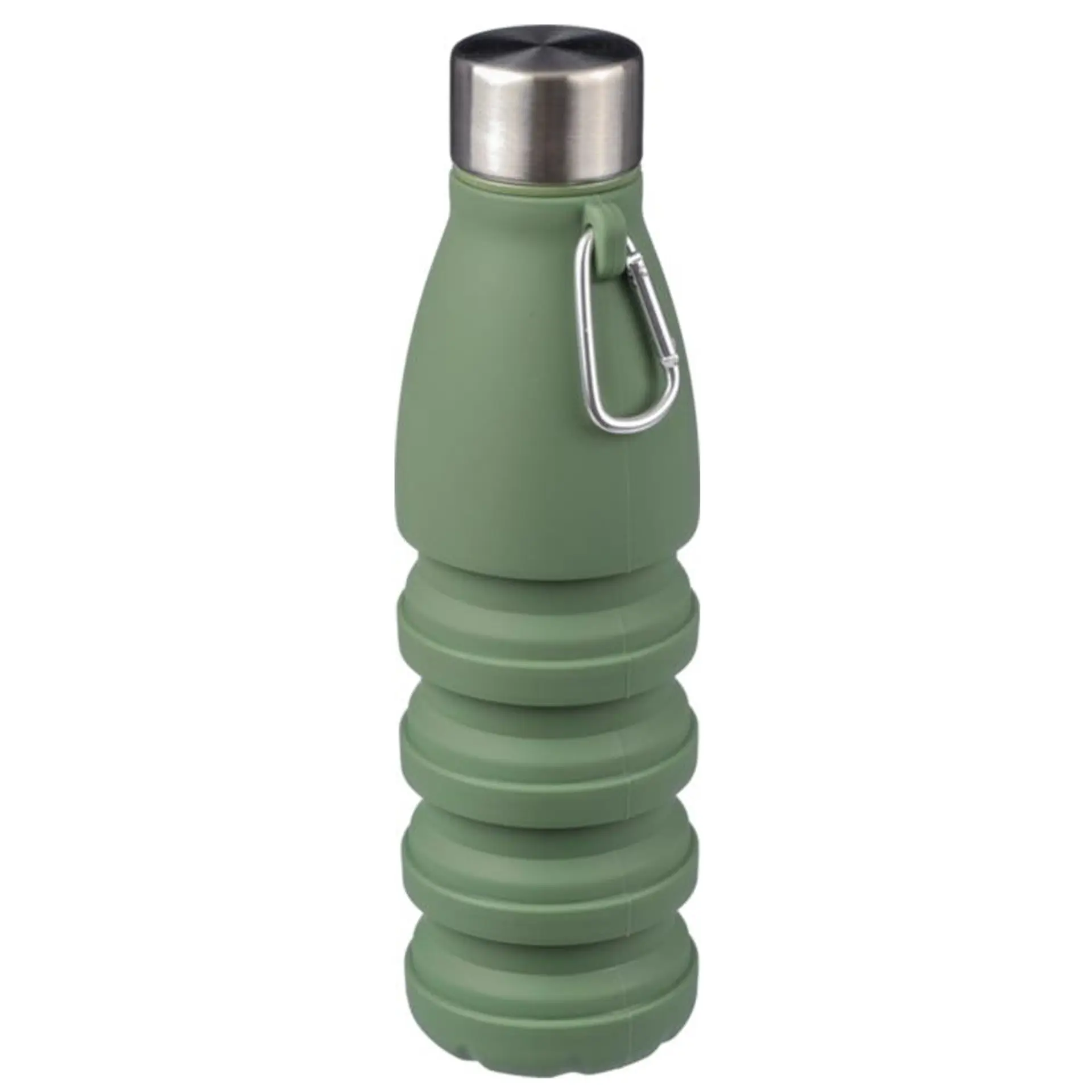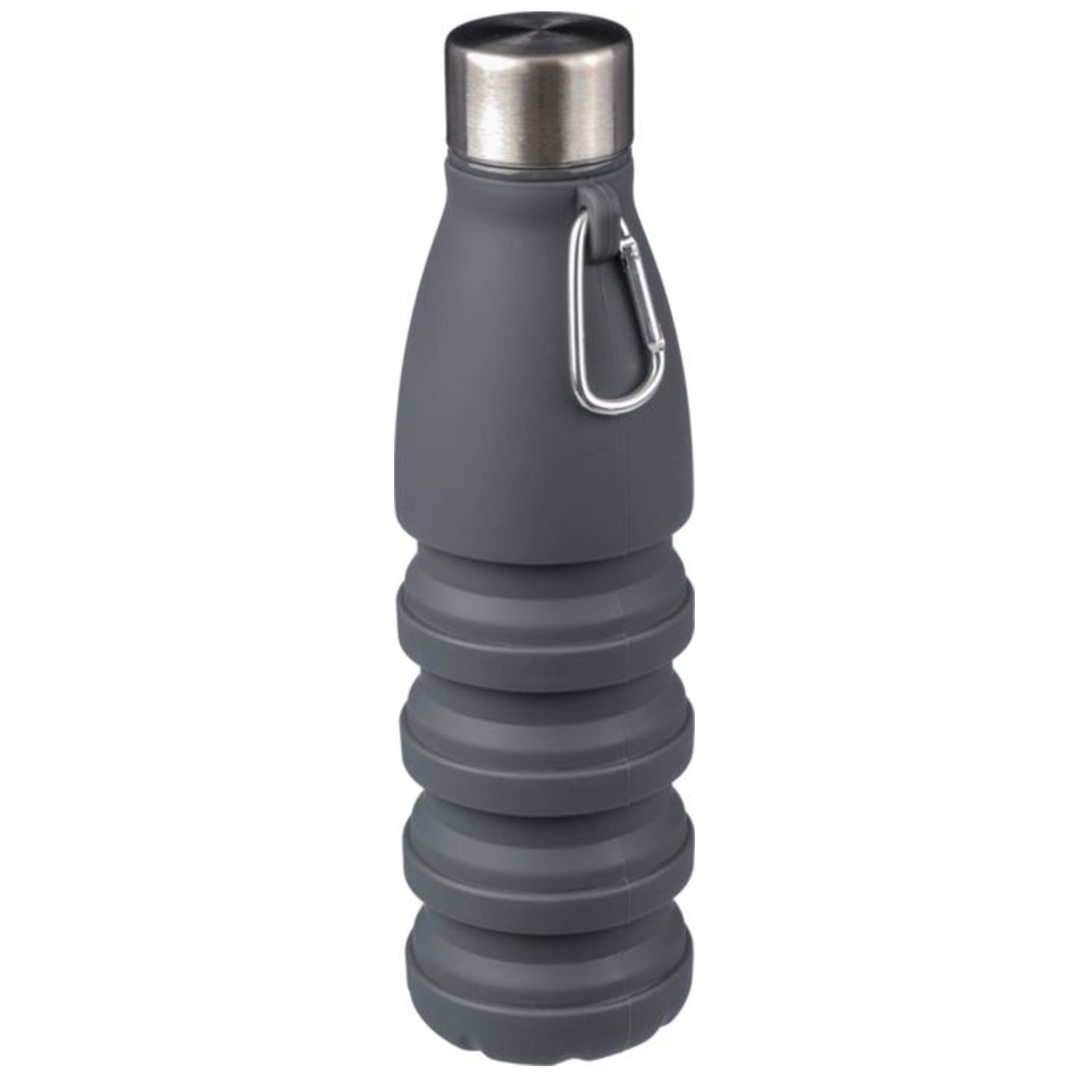 Gourde pliable en silicone d’une contenance de 550 ml avec couvercle en acier inoxydable et mousqueton en aluminium. Taille pliée : ø 7 x 17 cm, taille dépliée : ø 7 x 25 cm. Livrée en vrac