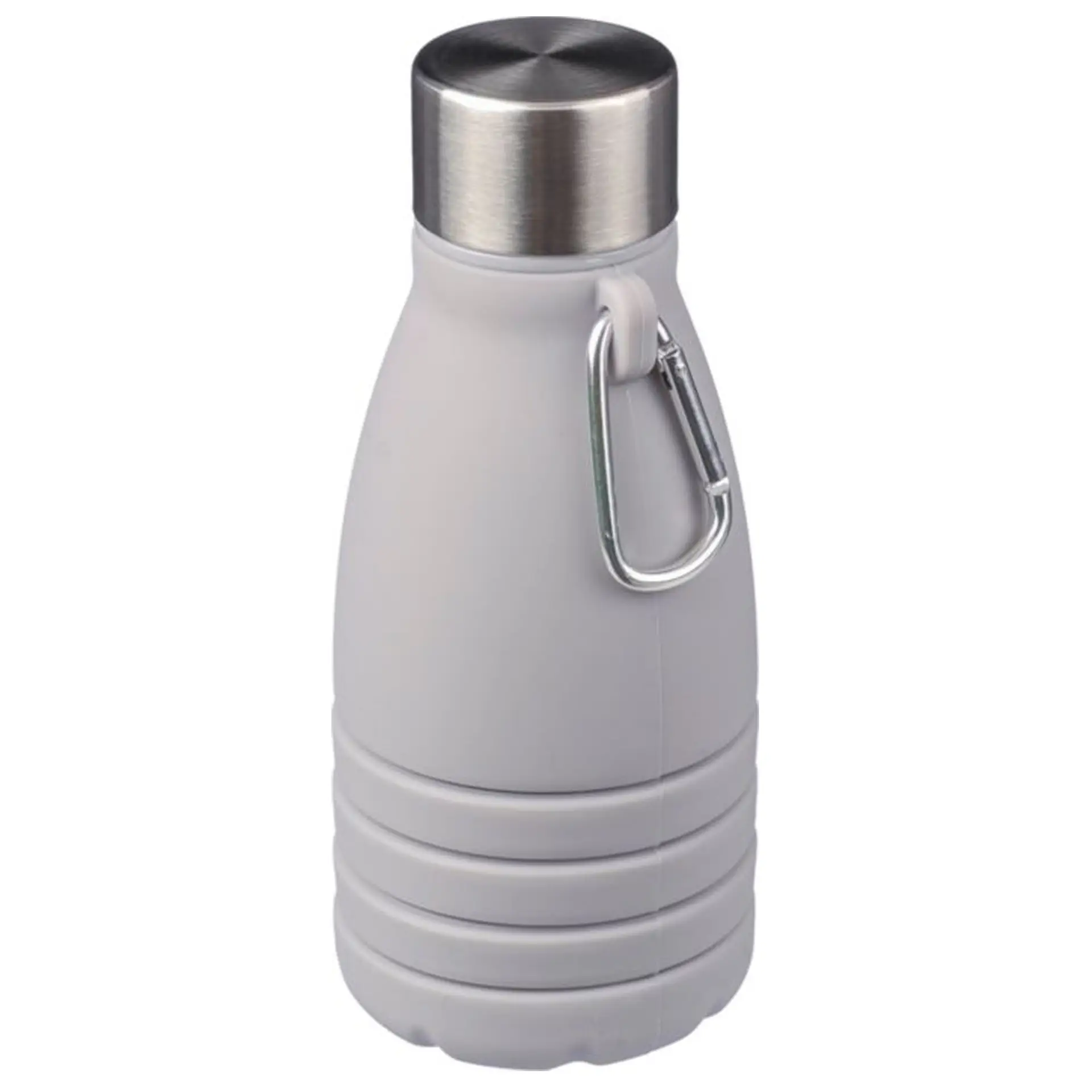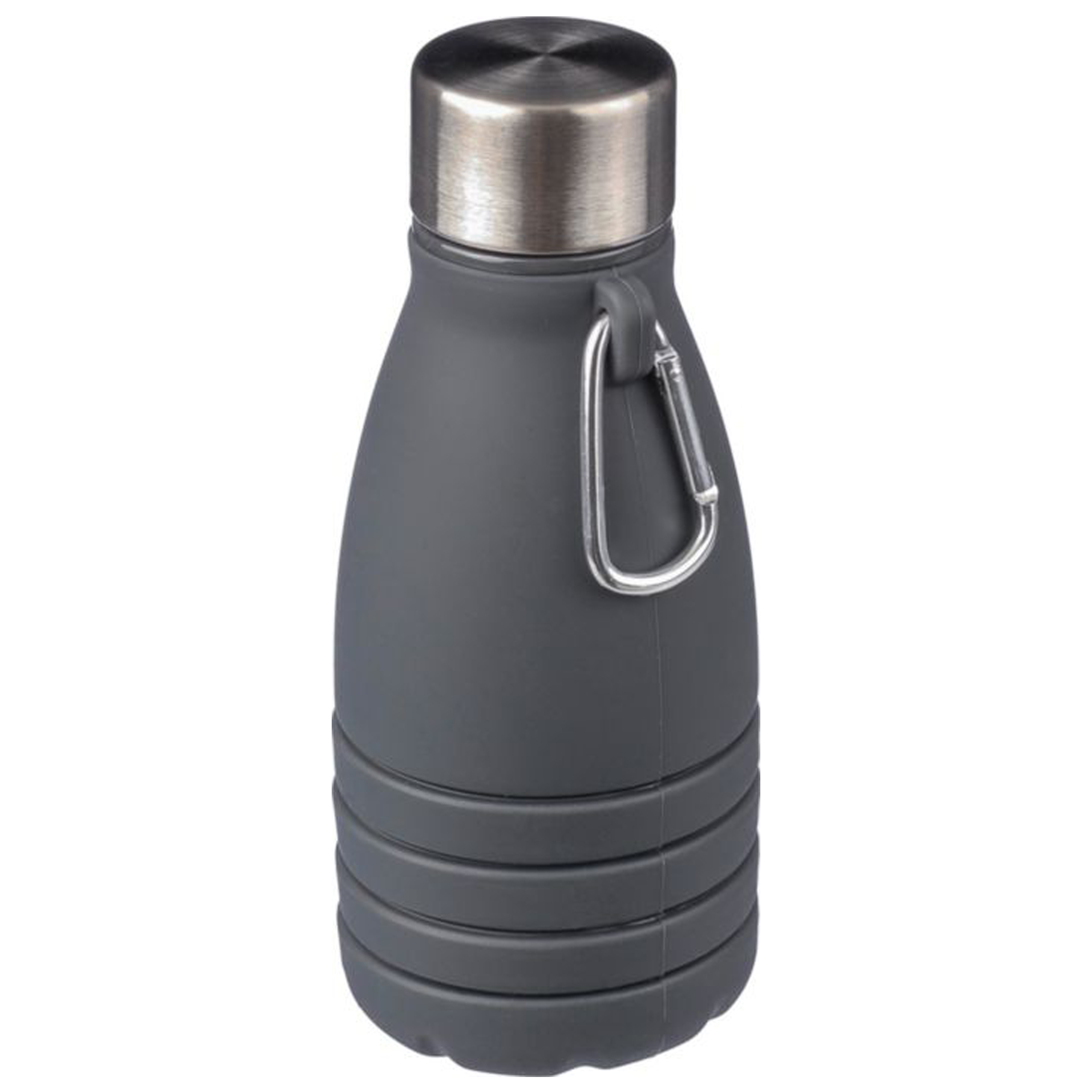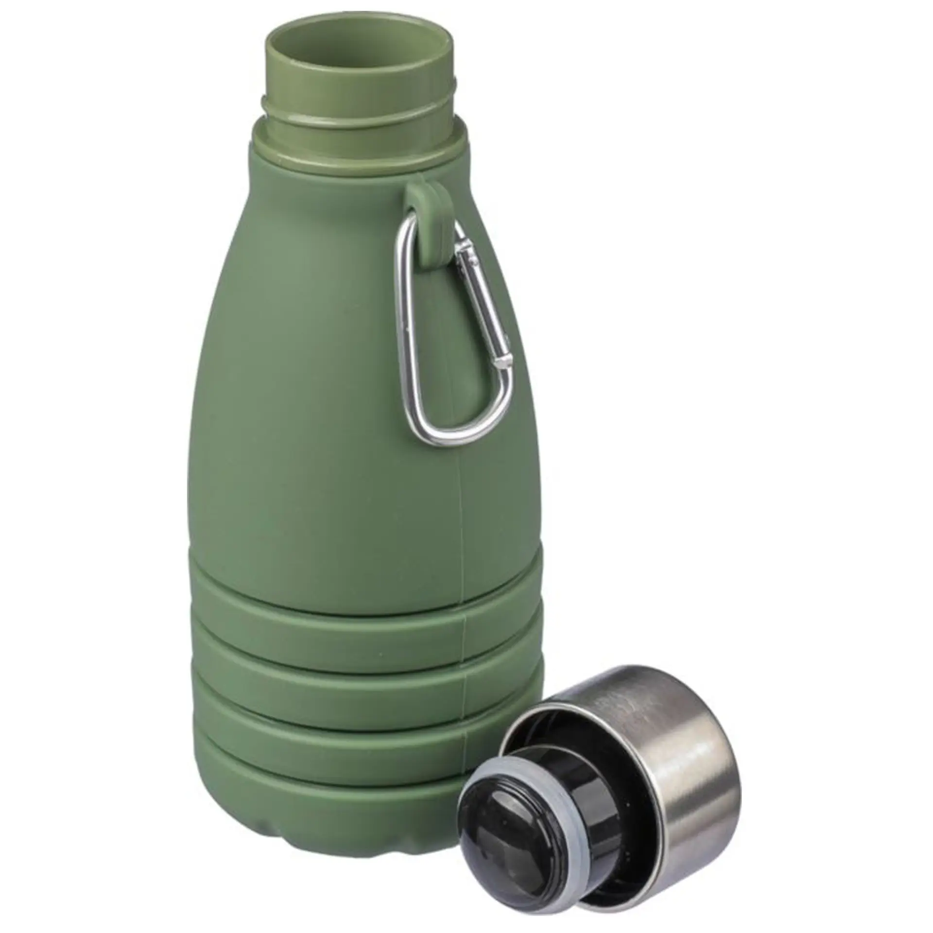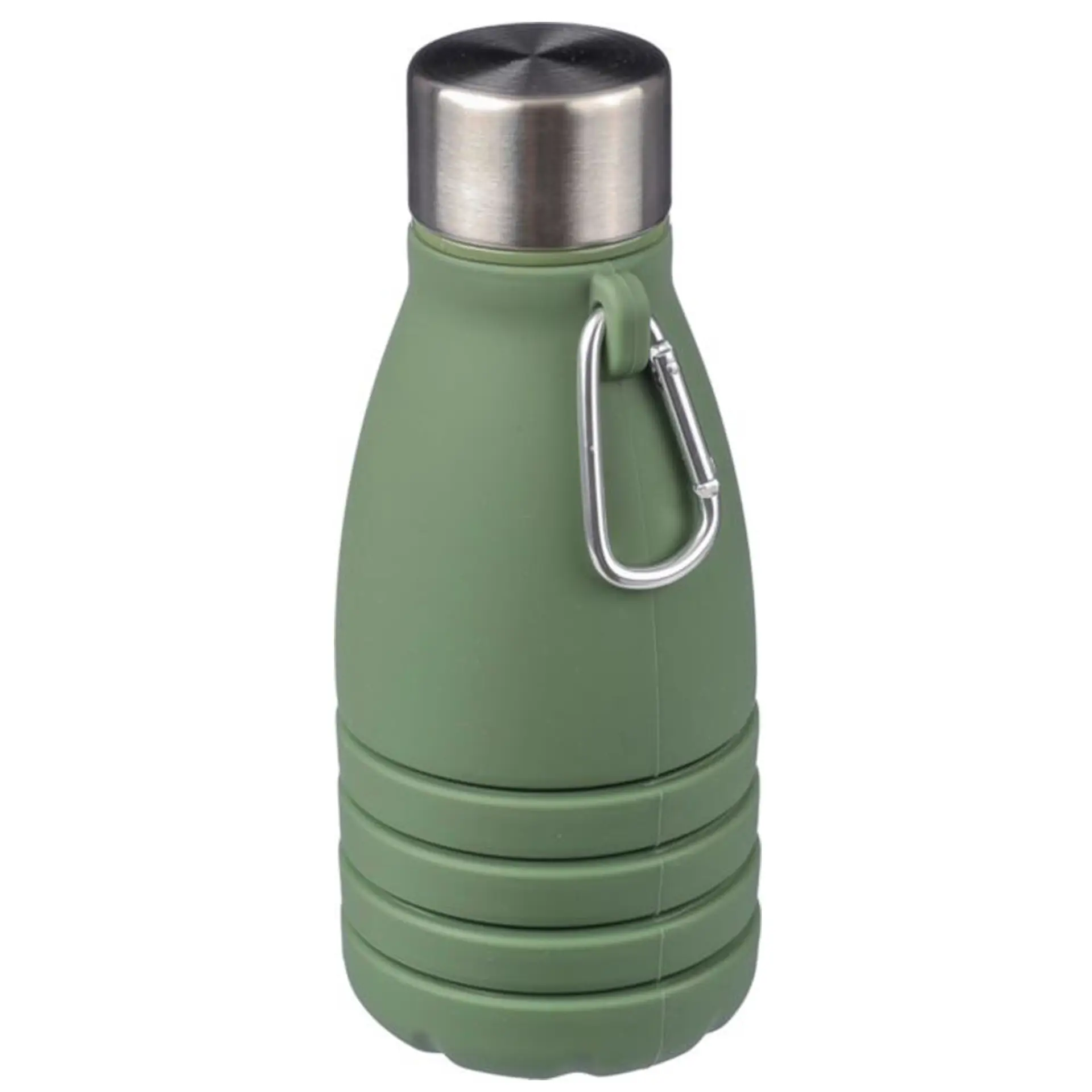 Gourde pliable en silicone d’une contenance de 550 ml avec couvercle en acier inoxydable et mousqueton en aluminium. Taille pliée : ø 7 x 17 cm, taille dépliée : ø 7 x 25 cm. Livrée en vrac